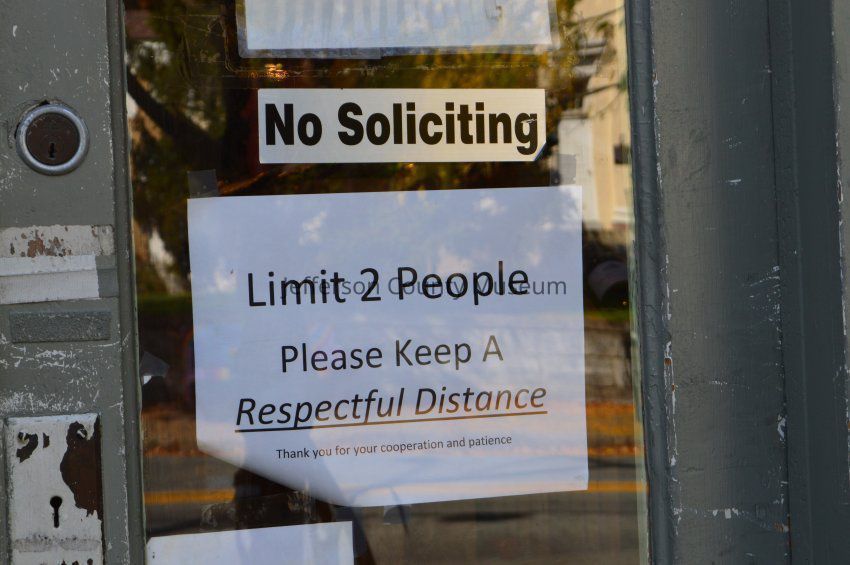 COVID-19 pandemic signs at Grapes & Grains Gourmet on East German Street in Shepherdstown in October 2020.