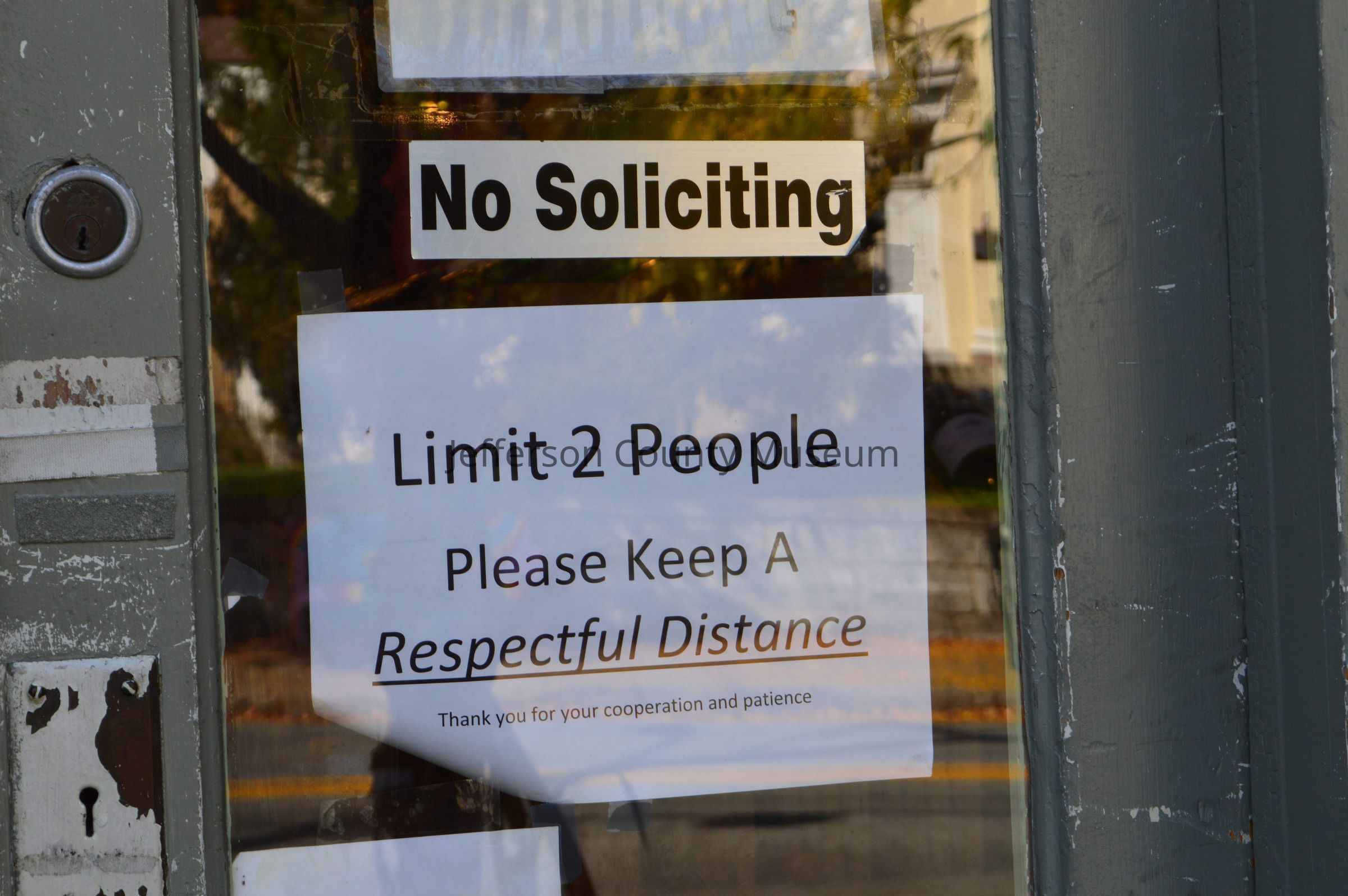 IMG3807003: Sign on window of front door that reads: Limit 2 People. Please Keep a Respectful Distance