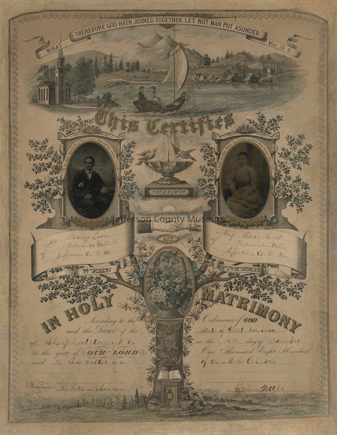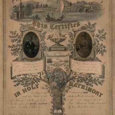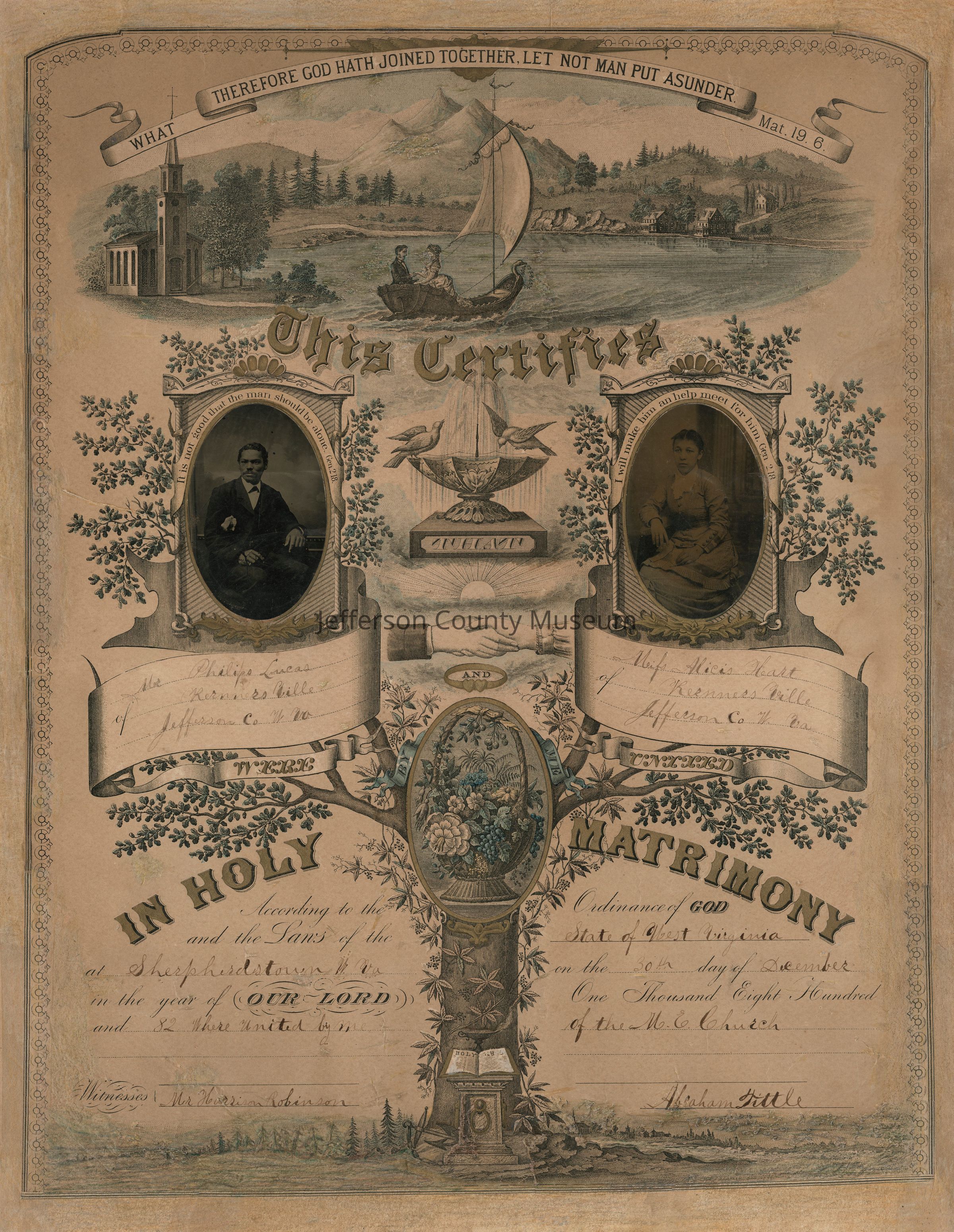 Certificate of marriage between two African Americans in 1882: Philips (Philip) Lucas of Kernnersville (Kearneysville), W. Va., and Alicis (Alice) Hart of Kernnersville (Kearneysville), W. Va. Witnessed by Harrison Robinson and Abraham Tittle. In color, highly decorated, and includes tintypes of the bride and groom. Copy is on display in museum on center partition.Acquisition