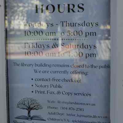 IMG3809006: Sign gives information about the Shepherdstown Public Library's current hours, policies, and procedures during COVID-19 pandemic.