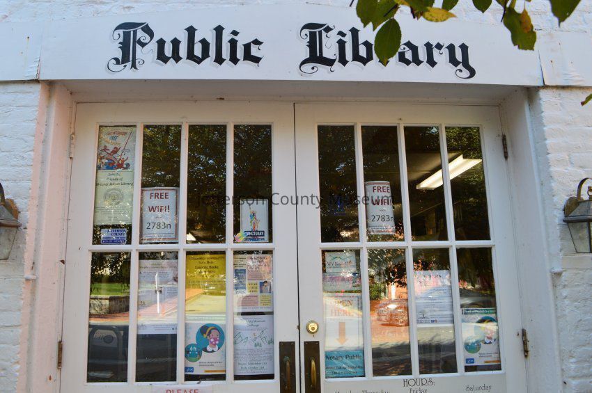 IMG3809001: Front doors of Shepherdstown Public Library with COVID-19 pandemic signs in windows.