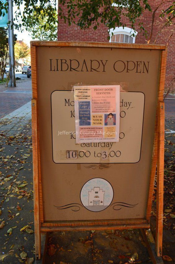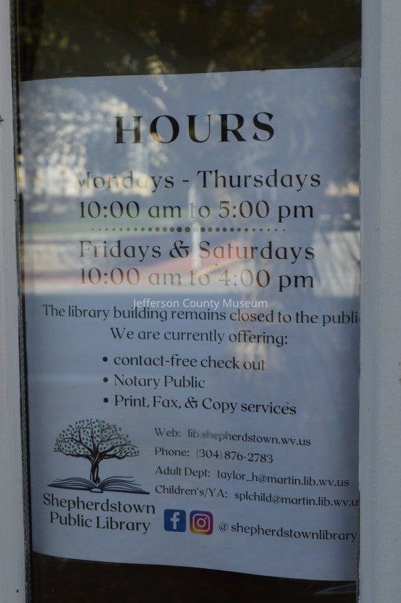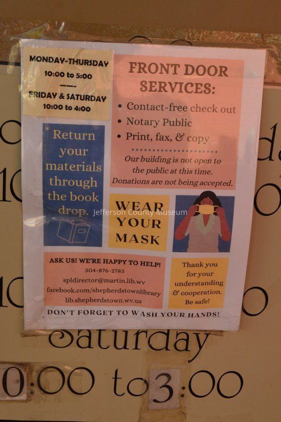 COVID-19 pandemic signs at Shepherdstown Public Library on East German Street in Shepherdstown in October 2020.