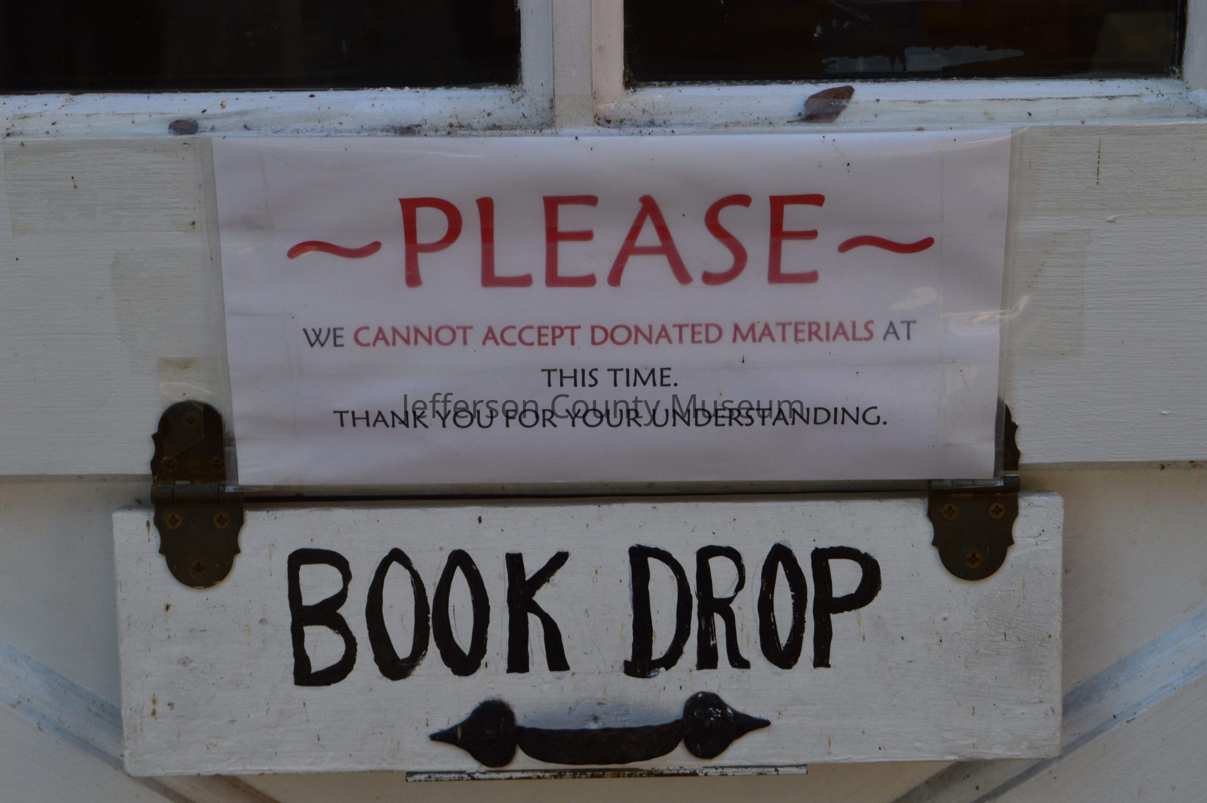 IMG3809002: Book drop with sign that reads: PLEASE WE CANNOT ACCEPT DONATED MATERIALS AT THIS TIME. THANK YOU FOR YOUR UNDERSTANDING.