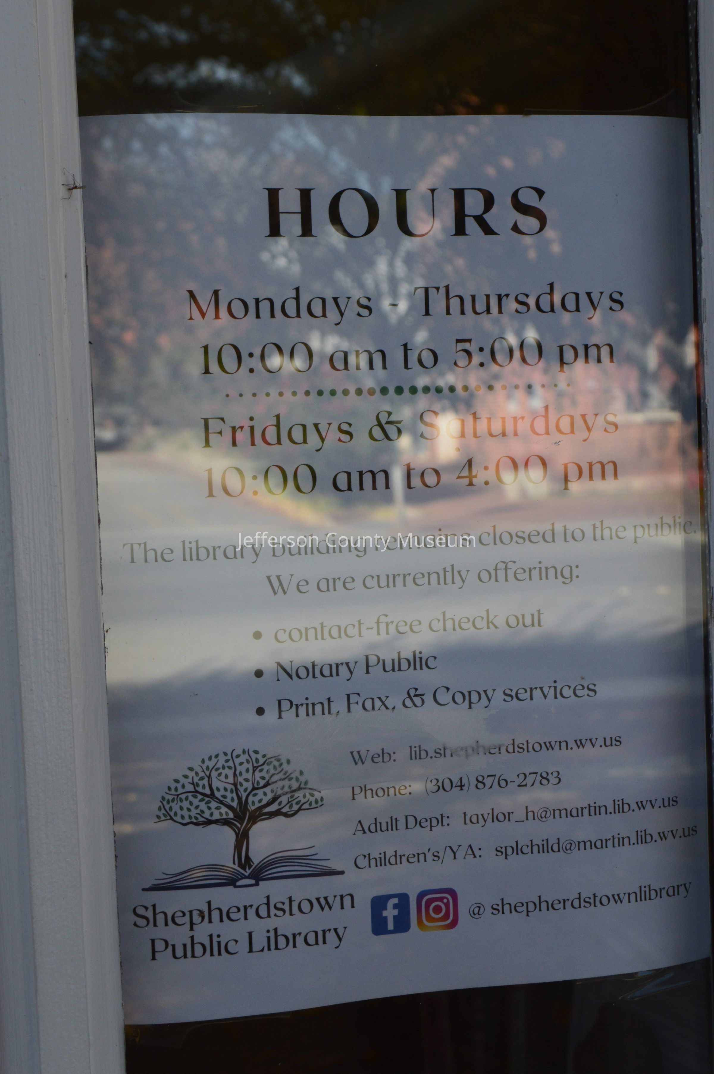 IMG3809003: Sign with Shepherdstown Public Library's hours indicating that the building remains closed to the public.