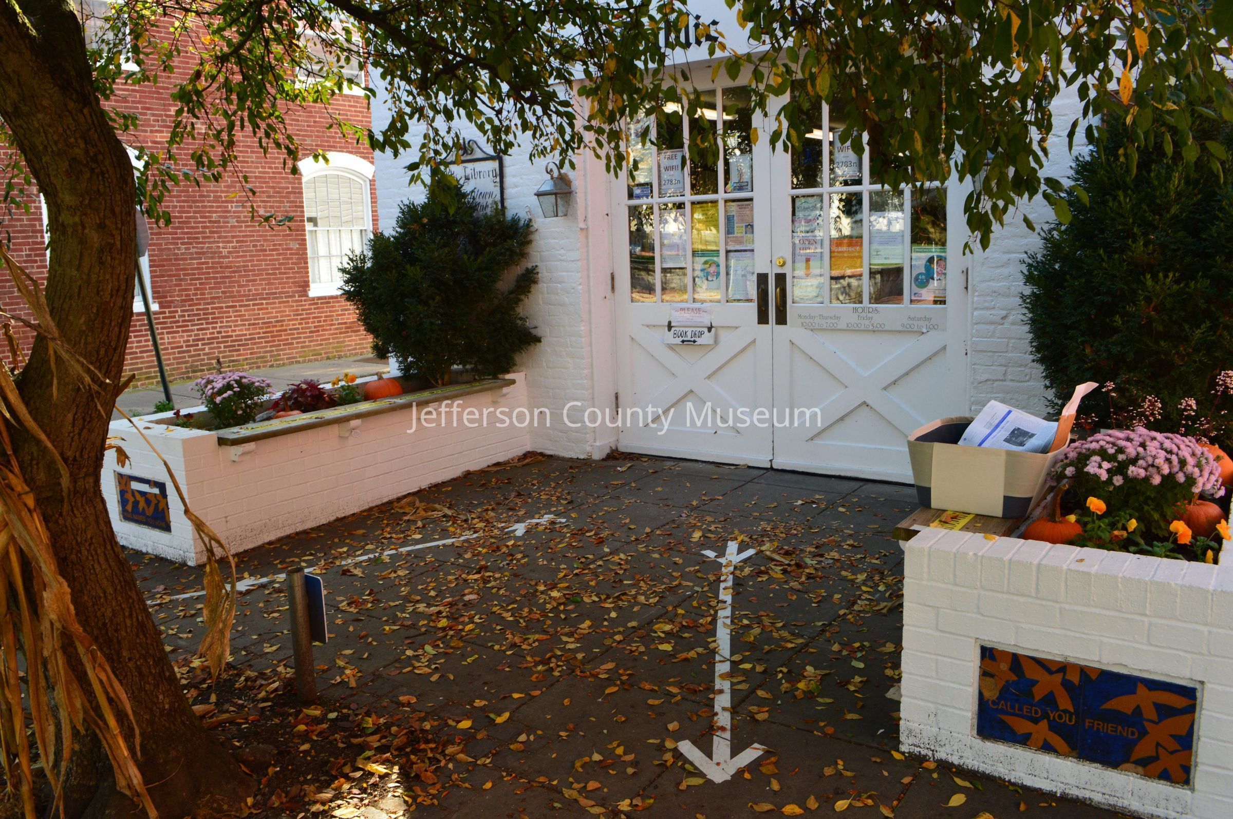 IMG3809004: Outside of Shepherdstown Public Library with white arrows on ground indicating suggested movement of people to prevent contact.