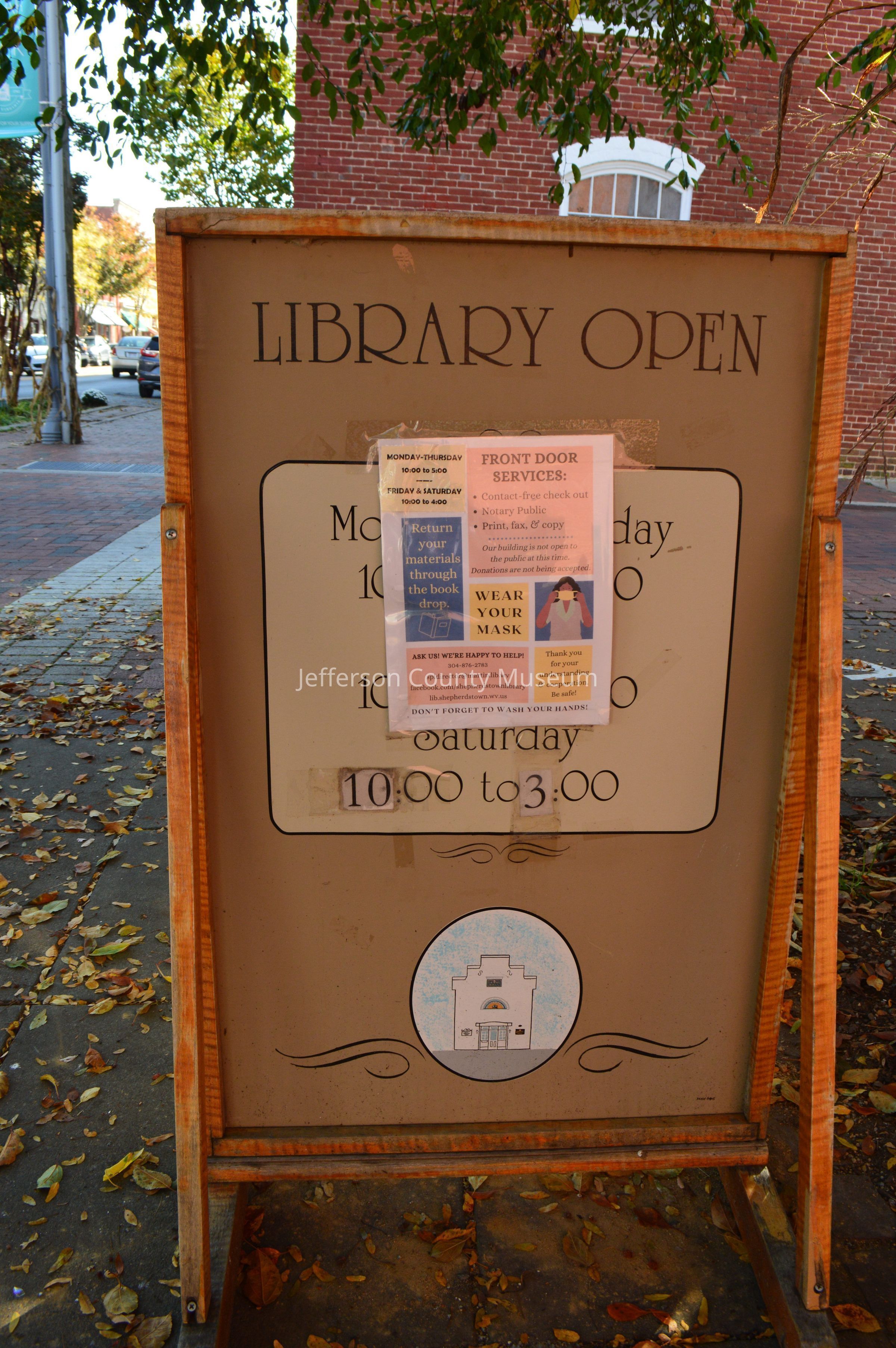 IMG3809005: Wooden sidewalk sign with information about the Shepherdstown Public Library's current hours, policies, and procedures during COVID-19 pandemic.