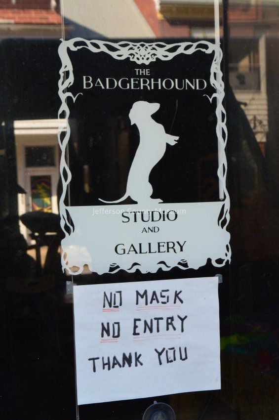 COVID-19 pandemic sign in window at Badgerhound Studio and Gallery on East German Street in Shepherdstown in October 2020. Sign reads: NO MASK NO ENTRY THANK YOU