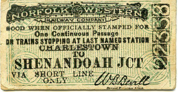 Norfolk & Western Railway Company ticket for a train between Charlestown and Shenandoah Junction via short line only. Stamped "1908" on reverse.Acquisition
