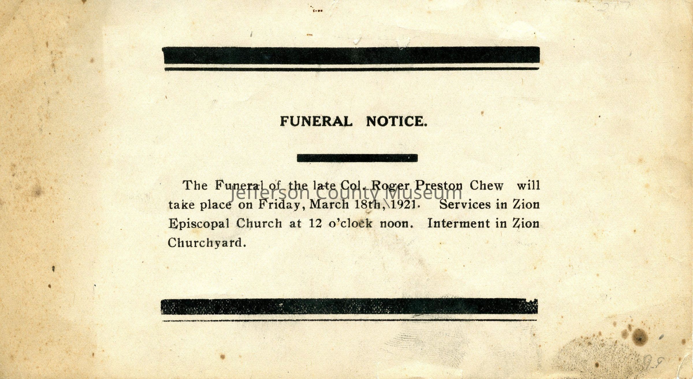 Funeral notice for Roger Preston Chew. Printed in black at top of paper: "FUNERAL NOTICE". Printed in black below that: " The Funeral of the late Col. Roger Preston Chew will take place on Friday, March 18th, 1921. Services in Zion Episcopal Church at 12 o'clock noon. Interment in Zion Churchyard." Black borders at top and bottom of notice.Acquisition