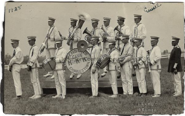Black and white photograph of two rows of men dressed in white uniforms and holding instruments with a bandleader in a dark uniform at the right. At center, the bass drum says "Henson's Gang /Klean Kut Klassy /Charlestown". This slogan is likely a reference to the Klu Klux Klan.Context