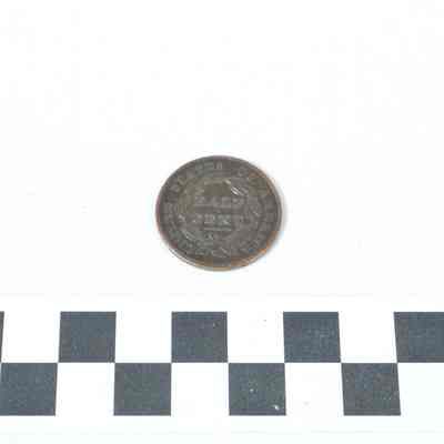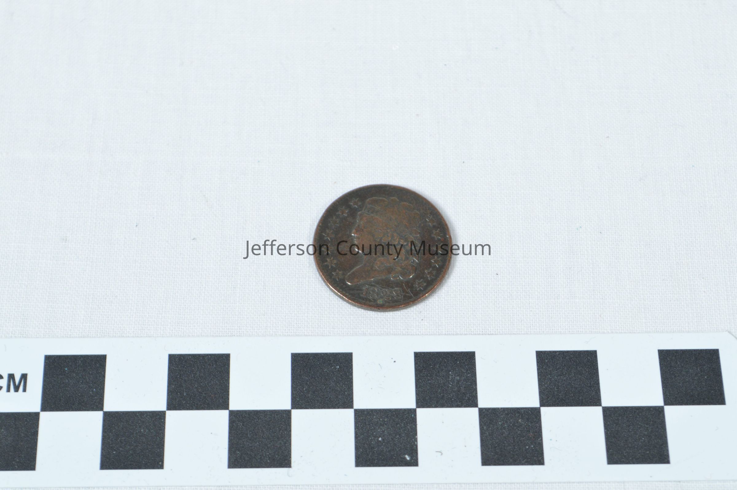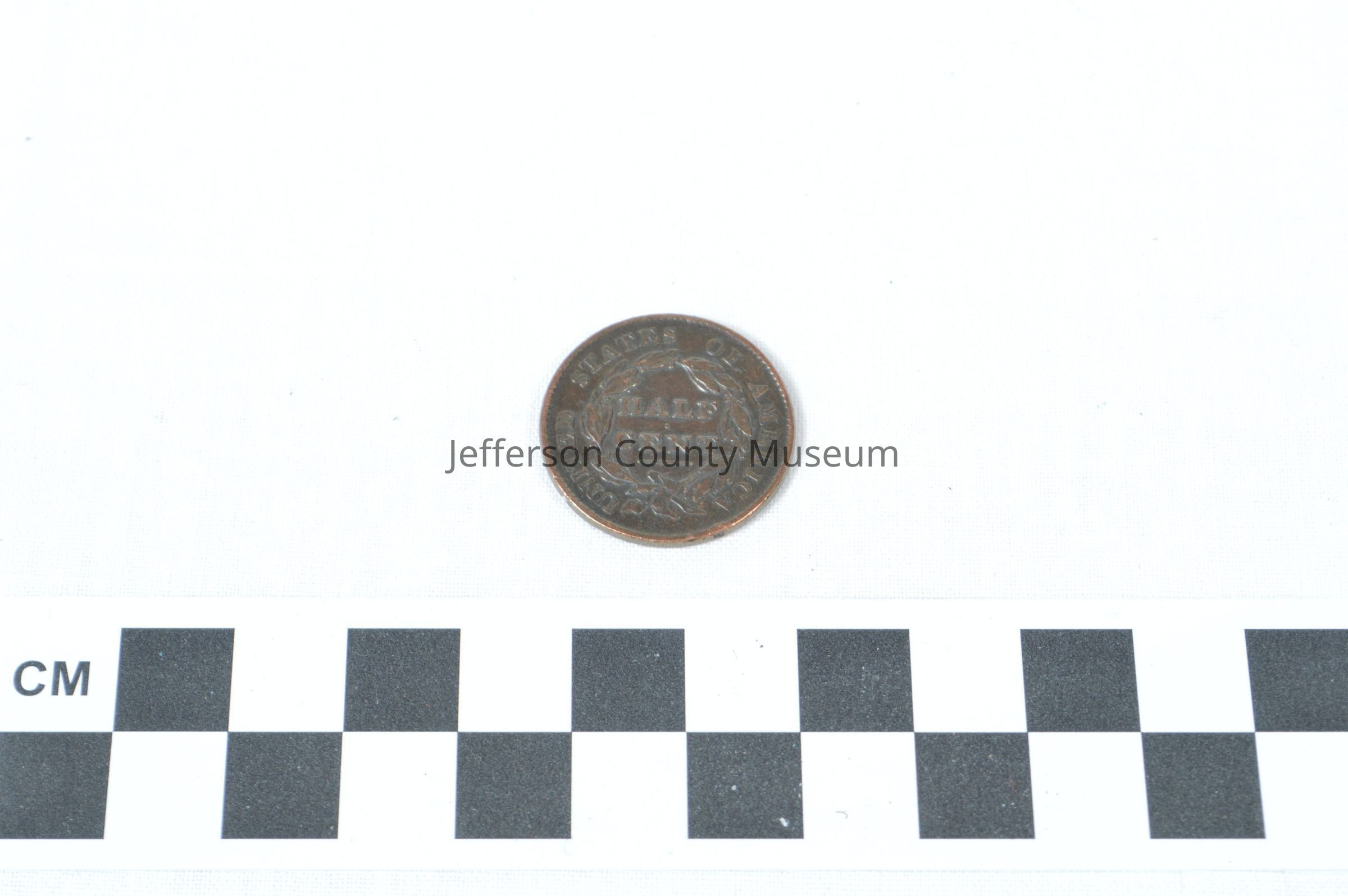 U.S. half-cent coin, 1828. On the front is Lady Liberty facing leftward with thirteen stars to the right and left of her. "1828" inscribed along the bottom of the coin. On the reverse side is "Half Cent" inscribed in the center. Surrounding this is a circular wreath that is bound together by a bow. Around the outside of the wreath is inscribed "United States of America." Outer edges of both sides are marked by raised notches.Acquisition