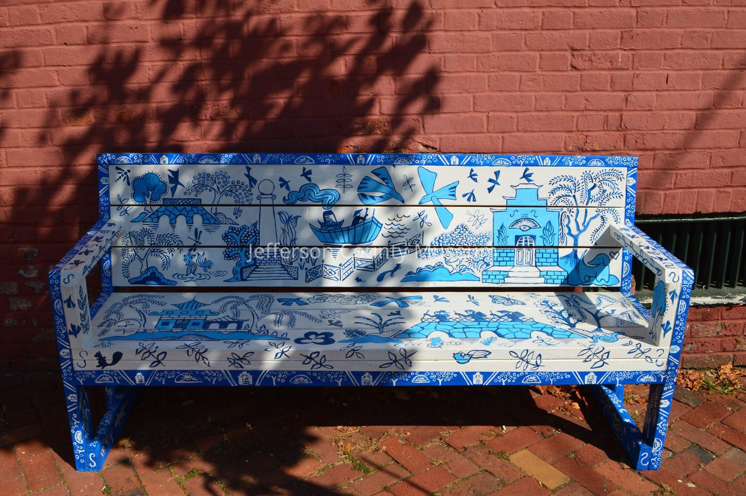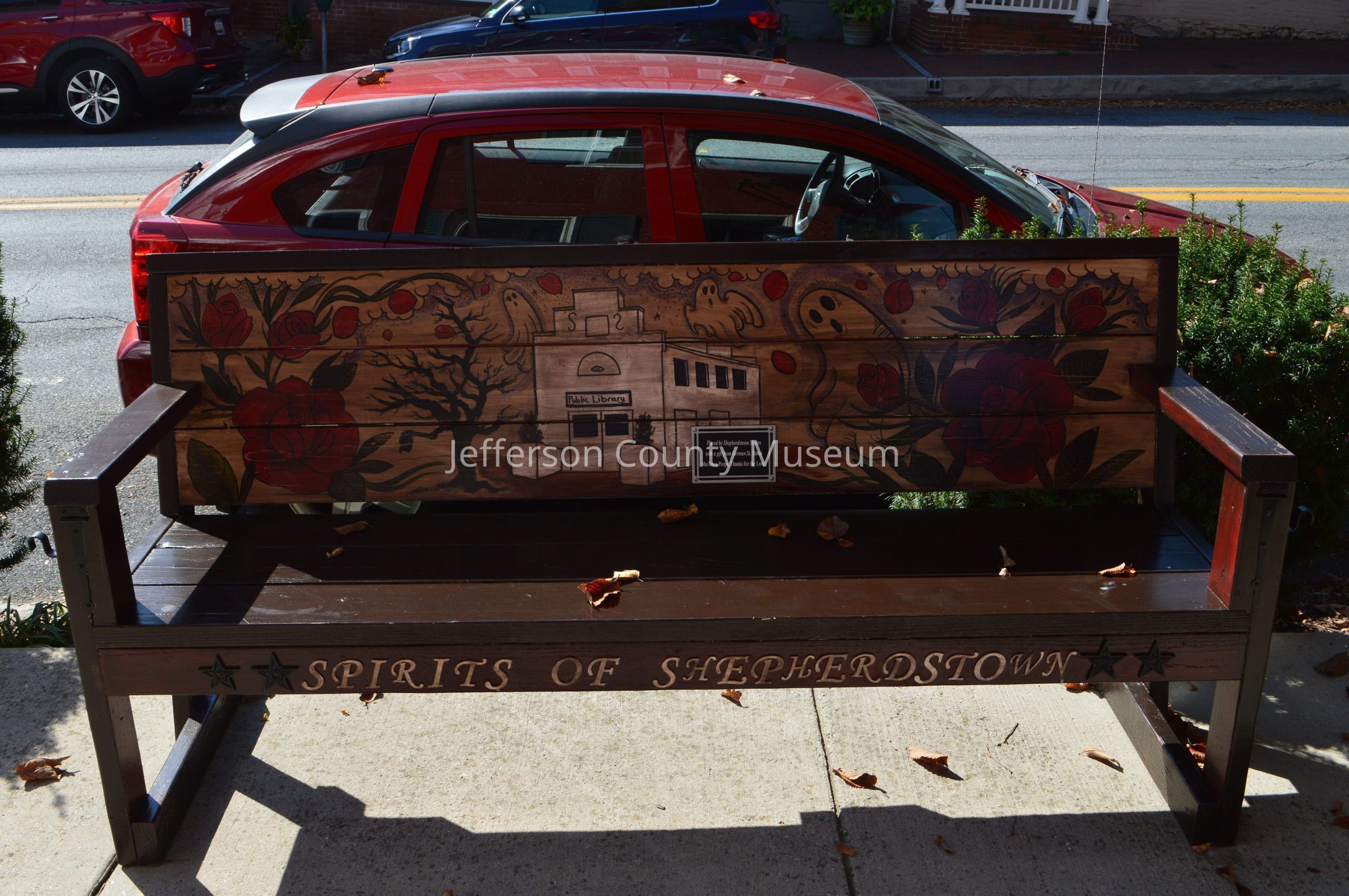 IMG3820002: Bench with painted Shepherdstown Public Library and ghosts. "Spirits of Jefferson" written along seat of bench.