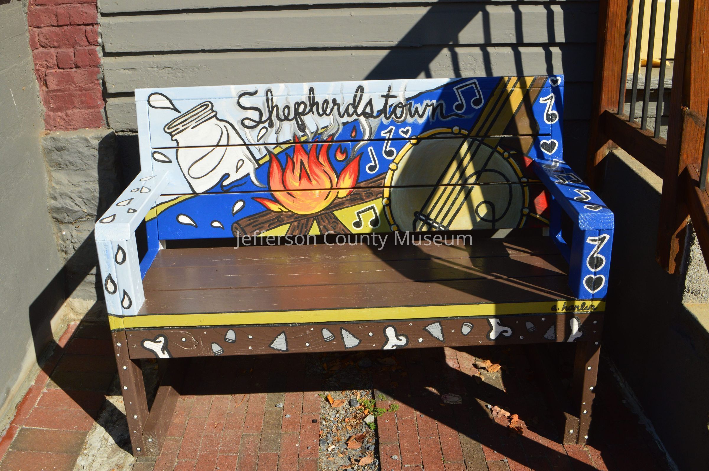 IMG3820004: Bench with painted banjo, fire, and jar. "Shepherdstown" is written at top of bench.