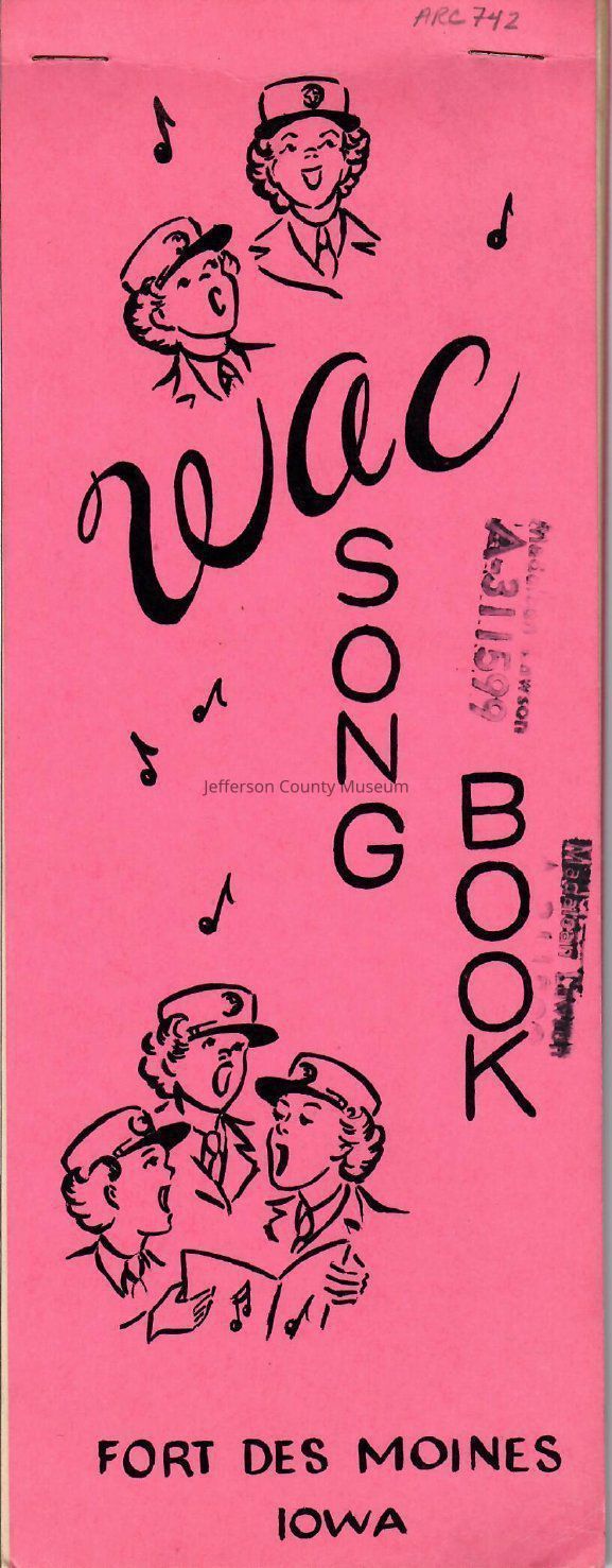 U.S. Women's Army Corps (WAC) Song Book. Pink paper covers with pictures of women in uniform; two staples at top of book; 24 pages plus index; Fort Des Moines Iowa. Book belonged to Madalean Lawson McIver. Her name is stamped on the front cover. See Media file for biographical information.Acquisition