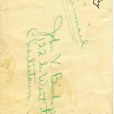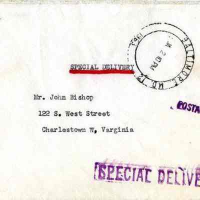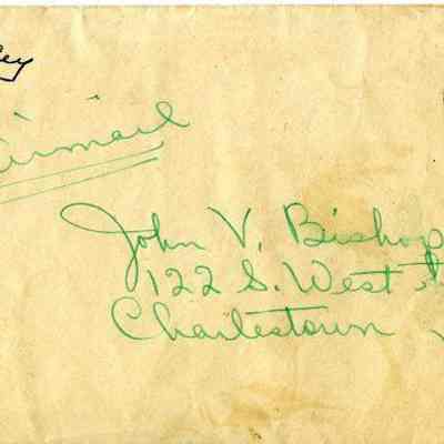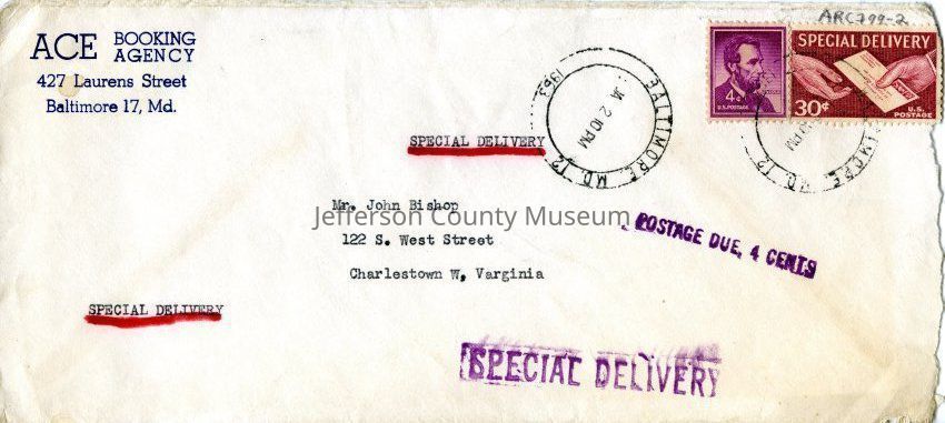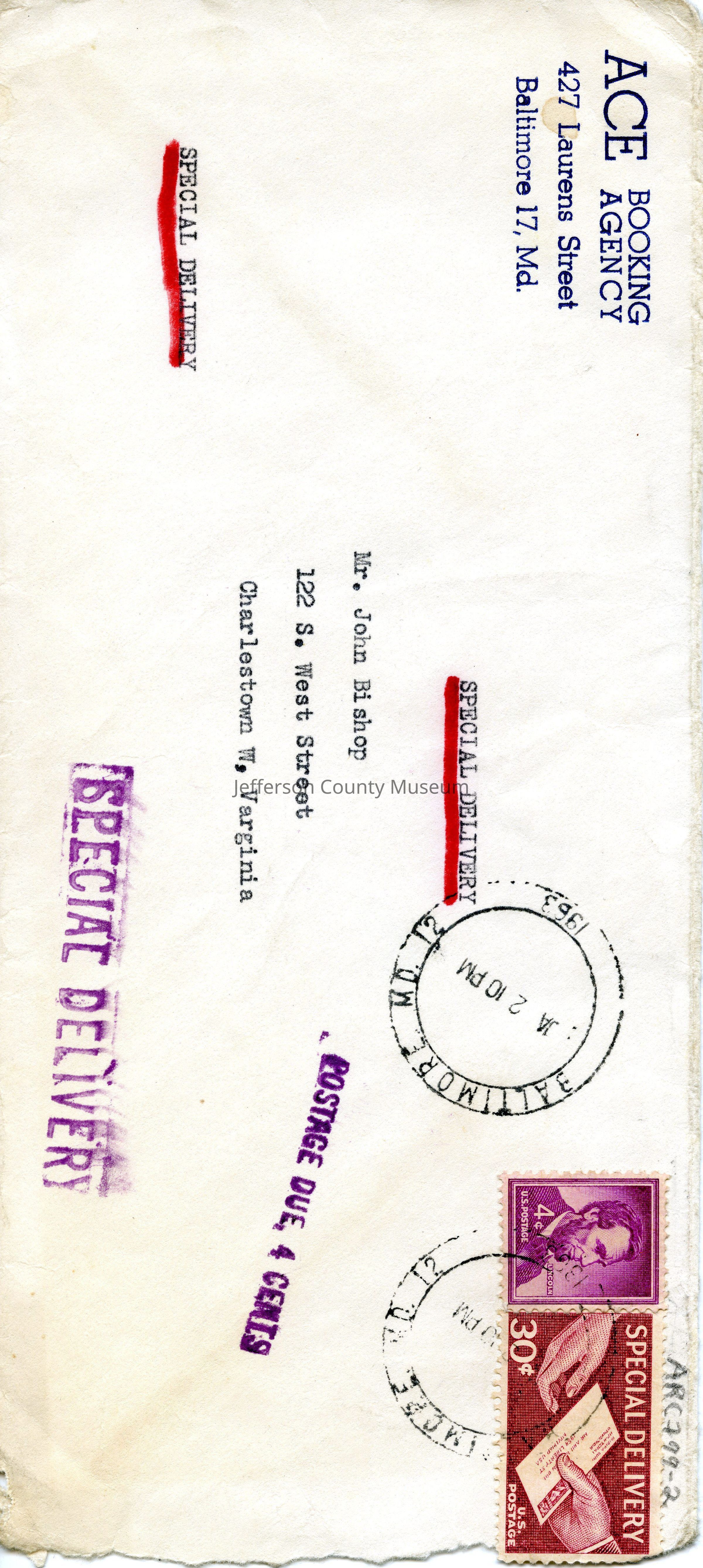 ARC799-2: No. 10 envelope addressed to John Bishop, 122 S. West Street, Charlestown, W, Virginia from the ACE Booking Agency, 427 Laurens Street, Baltimore 17, Md. Postmark appears to be 1963.Acquisition