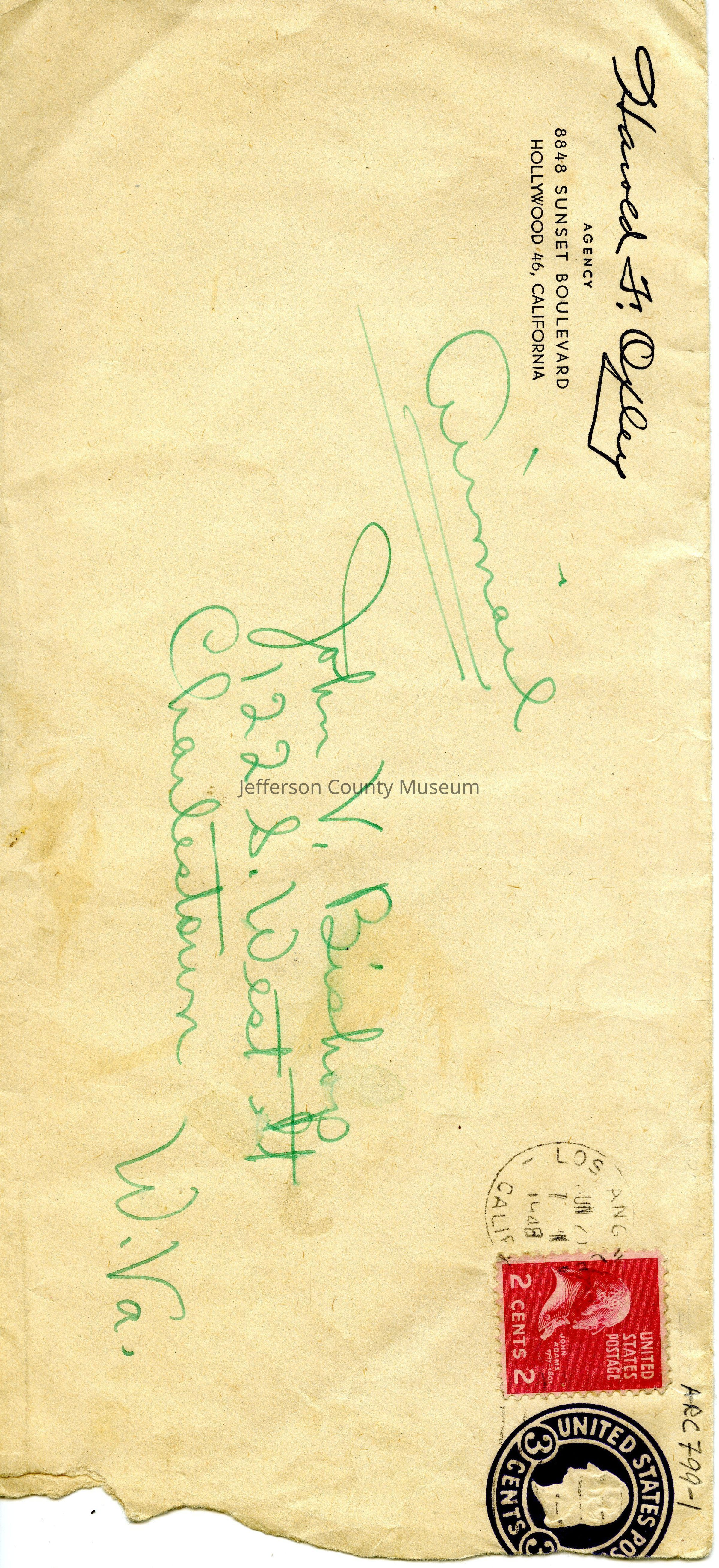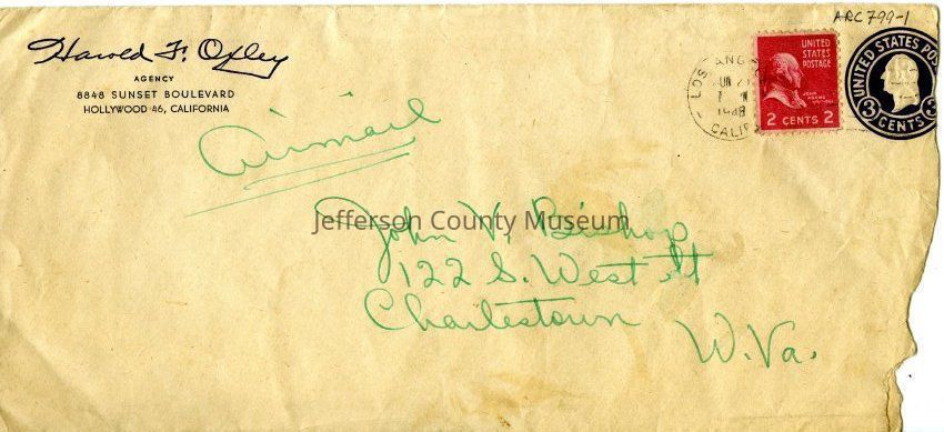 ARC799-1: No. 10 envelope addressed to John V. Bishop, 122 S. West St., Charlestown, W. Va. from the Harold F. Oxley Agency, 8848 Sunset Boulevard, Hollywood 46, California. Postmark appears to be 1948.