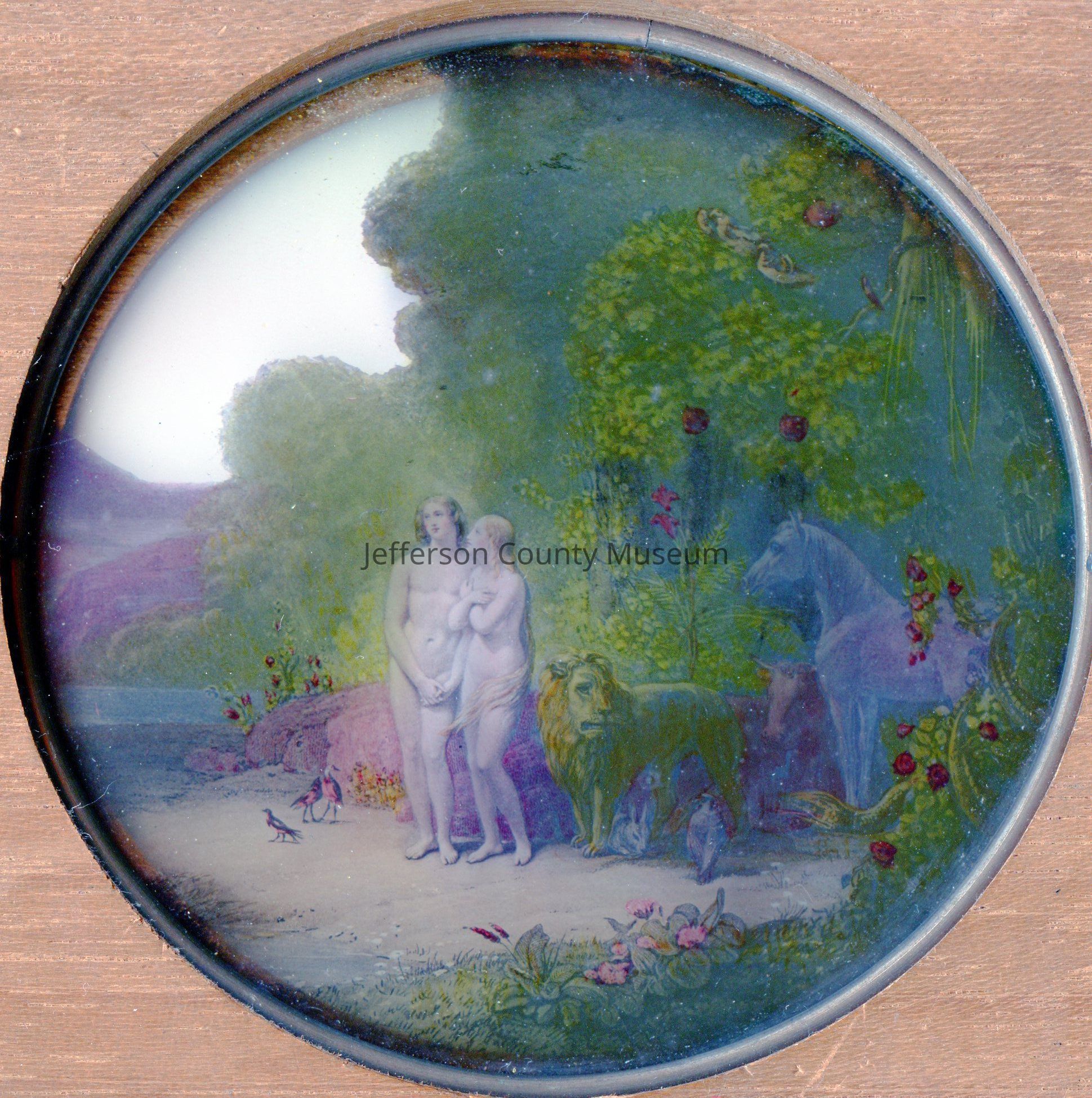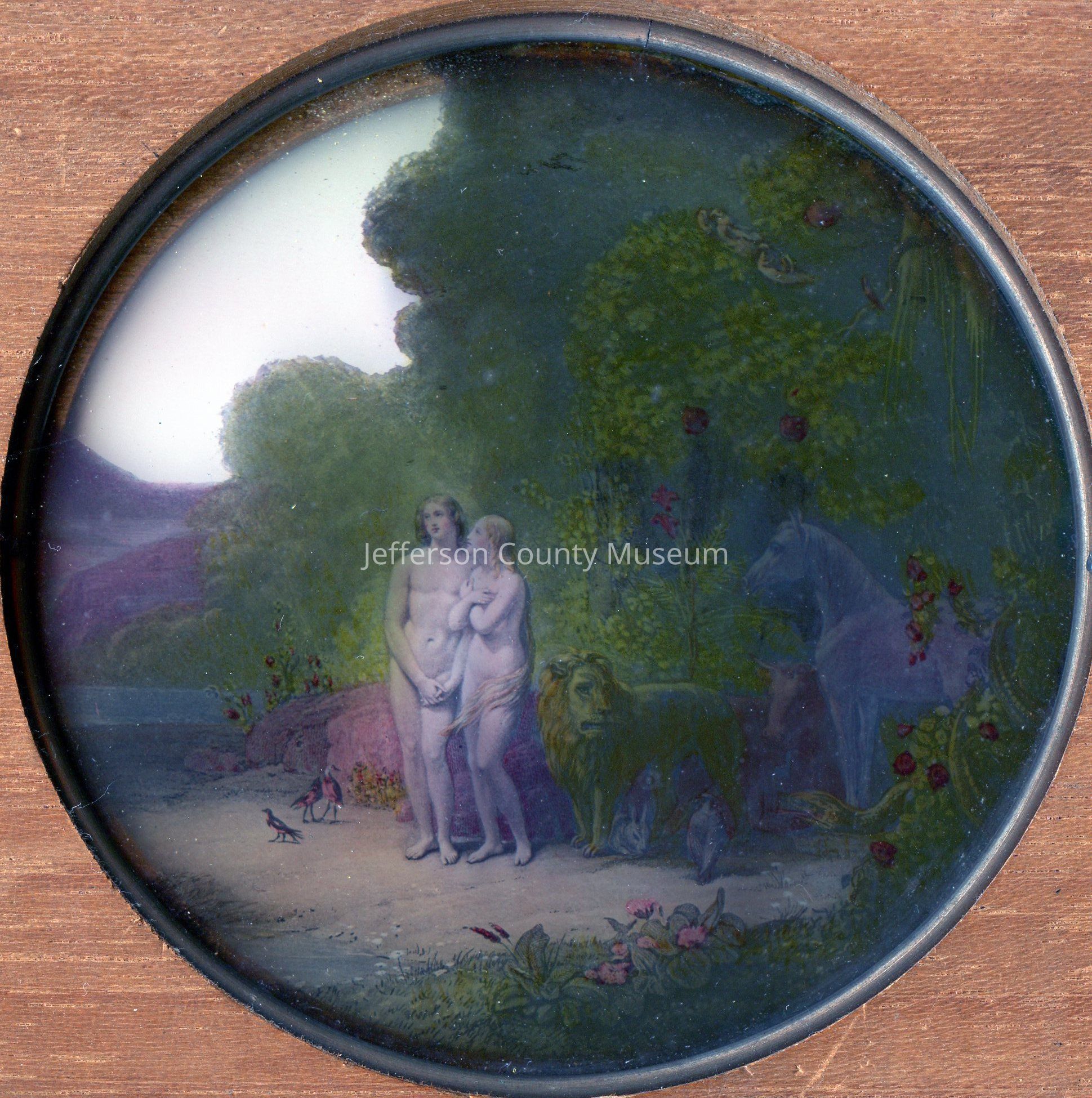 Glass slide mounted in wood frame to go inside projector. Scene is of Adam and Eve with a lion, cow, horse, snake and birds around them. Paper strip on bottom of frame says "Knights of Malta". Old paper tags have "A. Green #8" and "Slide 1".Acquisition