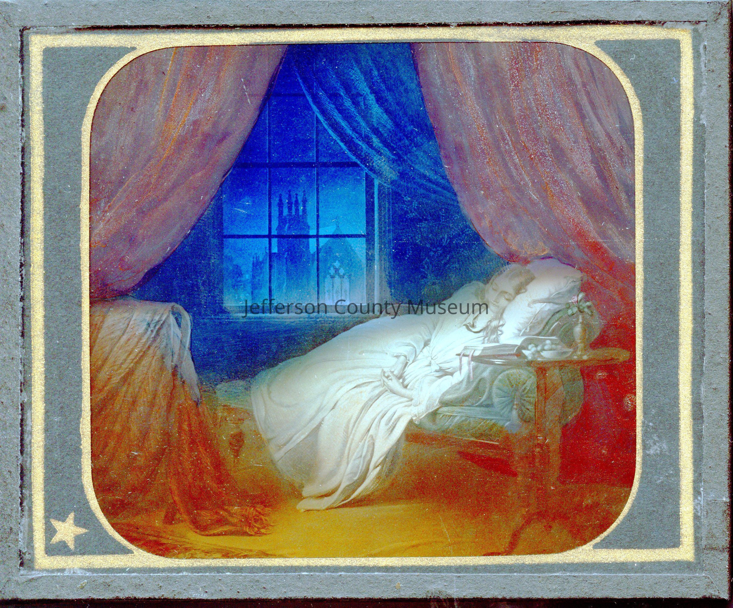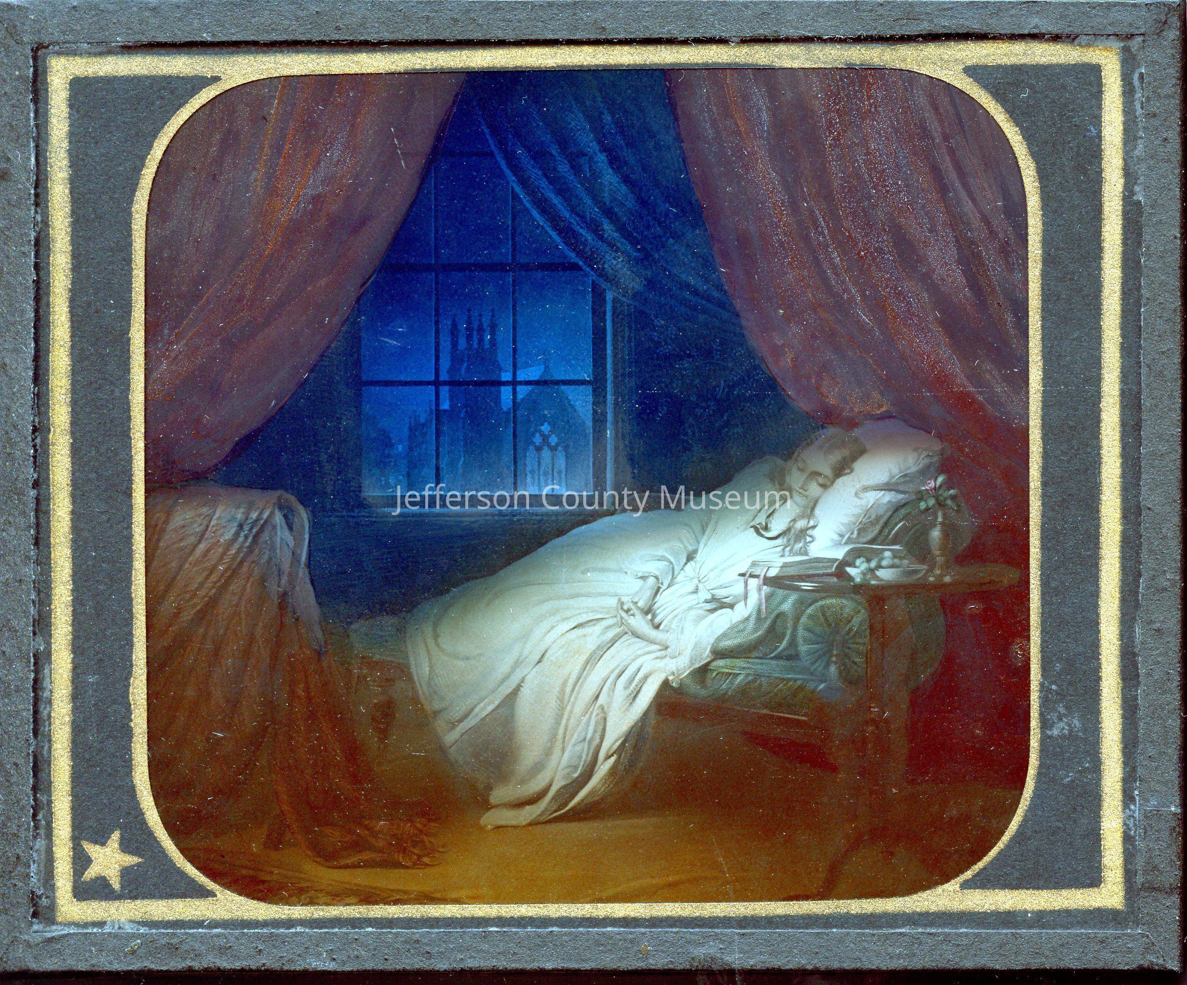 Rectangular glass slide with black tape around edges. Scene is of young girl sleeping on a chaise longue. A church and night stars are visible through window. Paper tag on one side has stamp "U. S. BUBB, MILTON, PA." Also printed on tag is "HOLY CITY. --last night I lay asleeping, there came a dream so fair."Acquisition
