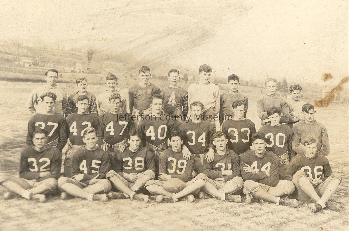 Harpers Ferry High School's 1934 football team. James William "Bill" Merchant is in middle row, far right, in a plain jersey. Oliver P. Merchant, his brother, is in the middle row, second from left, jersey number 42.