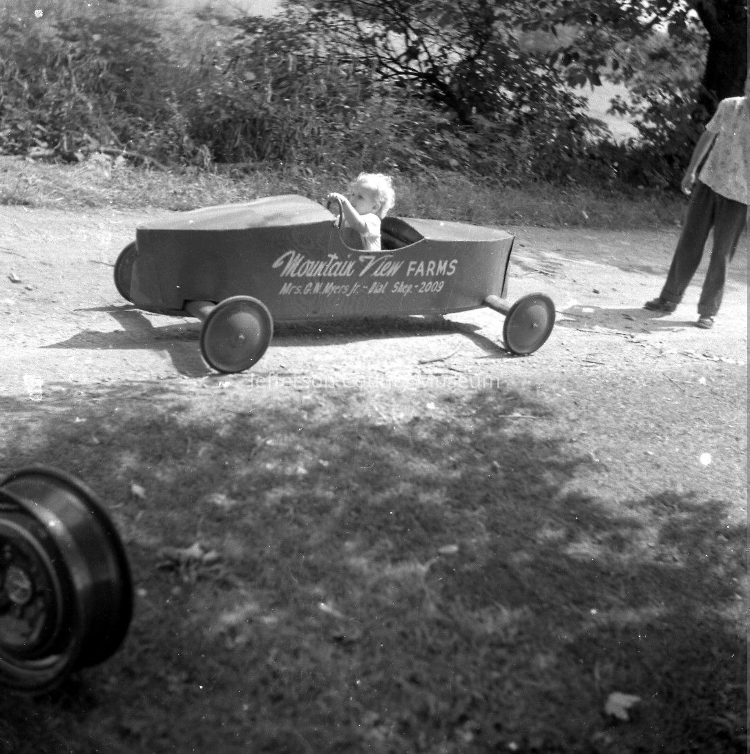 Jim Merchant sitting in car and George William "Billy" Myers, III. standing off to the right at George William Myers Jr. and Marian Merchant Myers' farm near Shepherdstown.