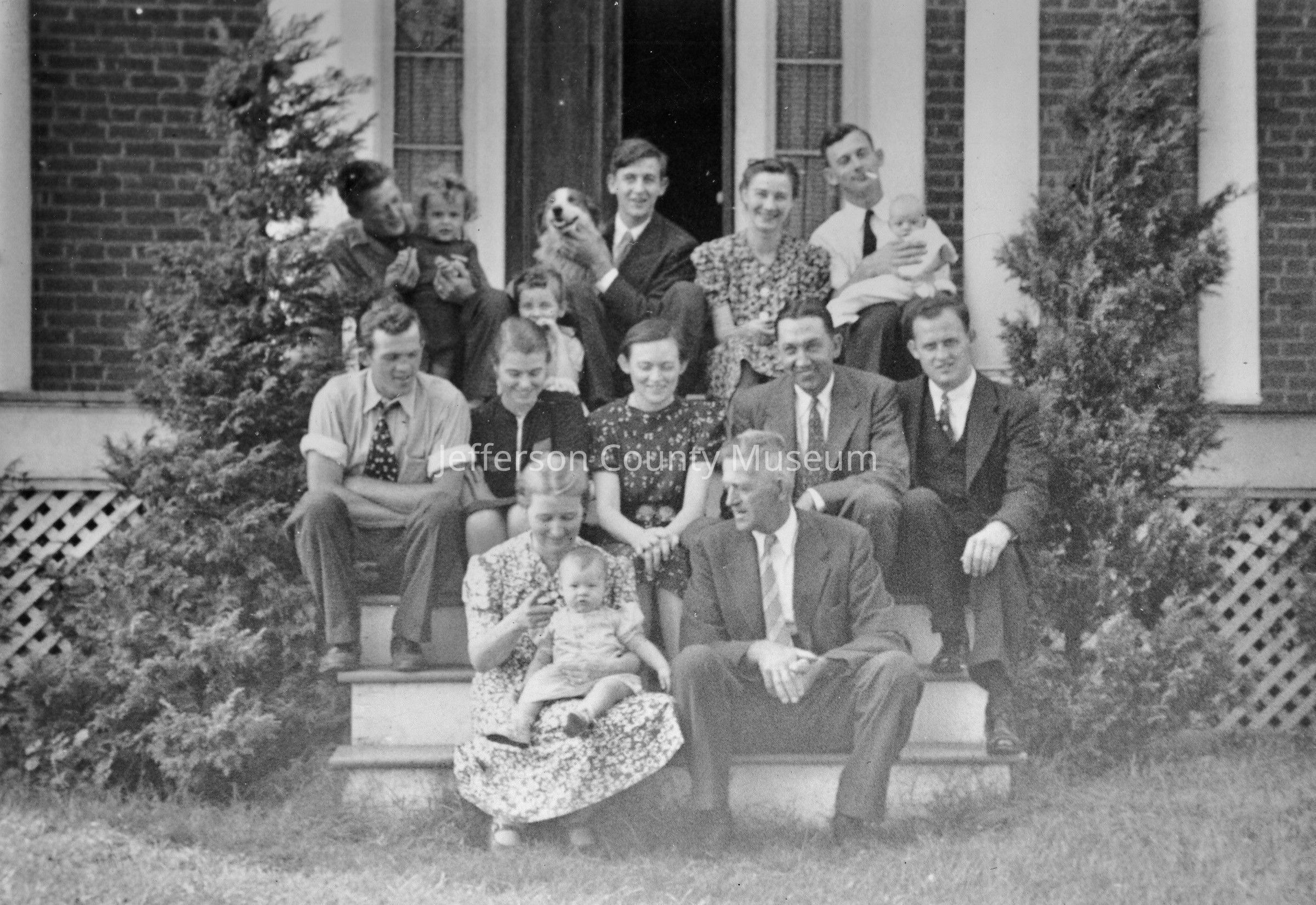 Merchant family on porch of house at Oliver M. and Agnes Merchant’s farm in Bardane (also known as the Tackley Farm), circa 1940. Back row, left to right: Don Merchant with George William "Billy" Myers, III., Donna Lee Myers, Bob Merchant, Ina and David (Jinks) Merchant with their daughter JoAnn. Middle row, left to right: Oliver P. and Marybelle Merchant, Marian Myers and George William Myers, Jr., James W. Merchant. Front row, left to right: Agnes Engle Merchant holding Virginia (daughter of Oliver and Marybelle), Oliver M. Merchant.