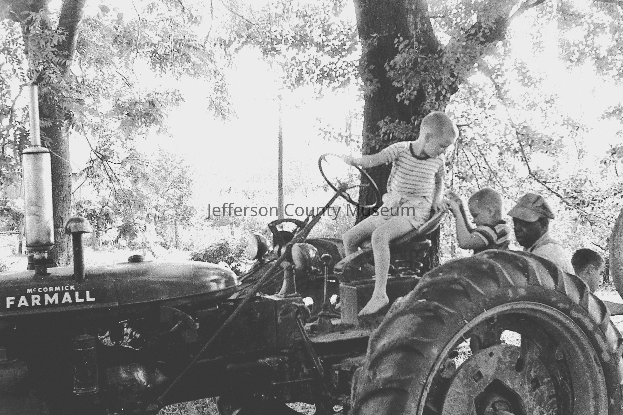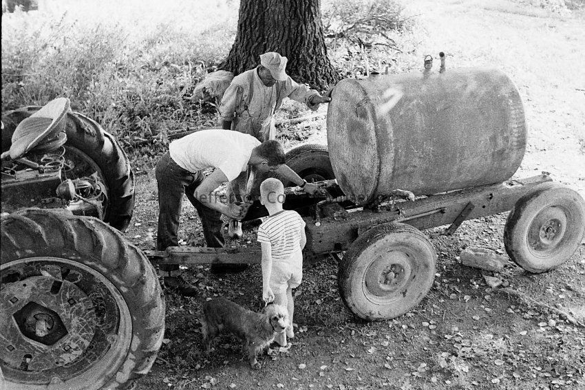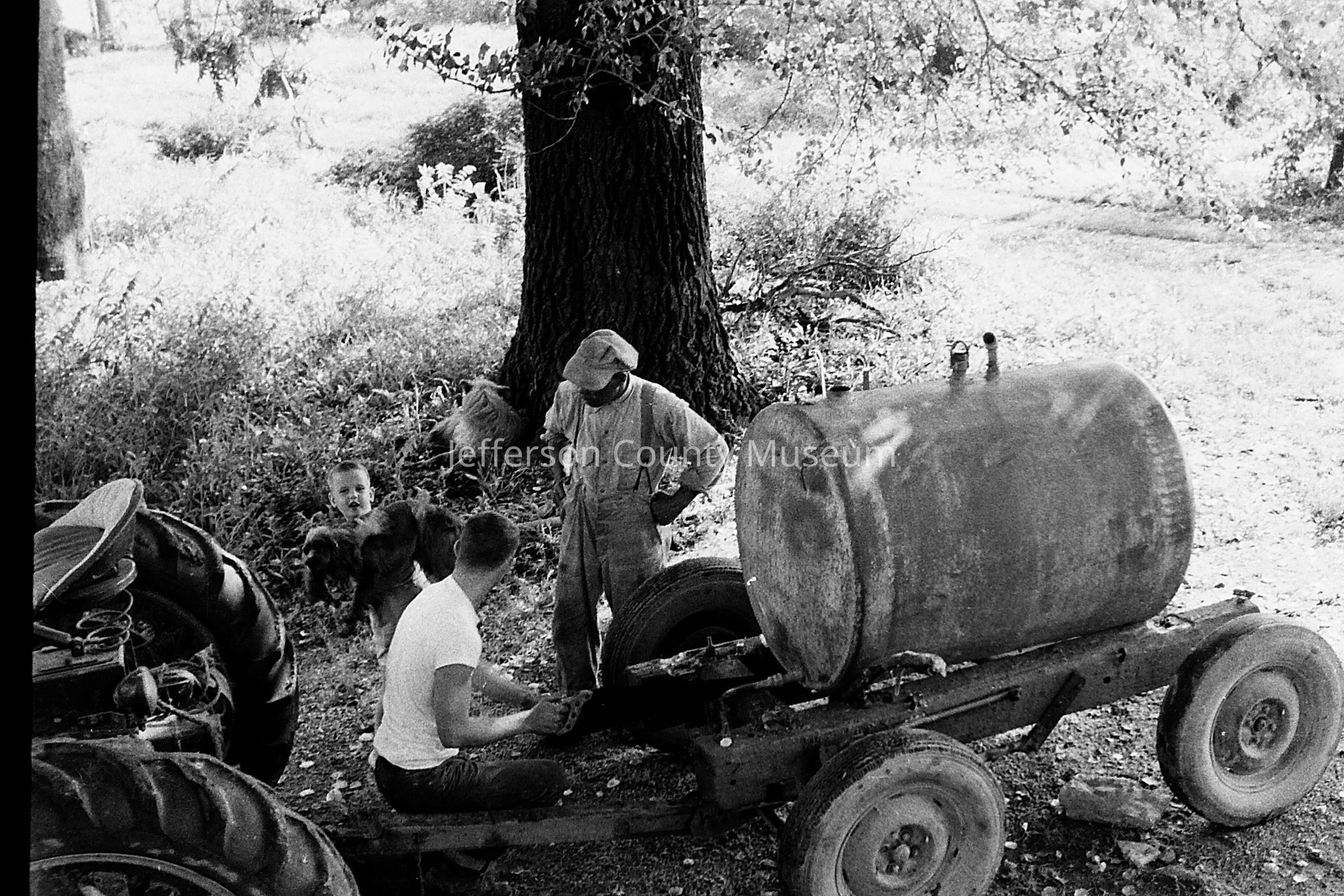 George William "Billy" Myers, III. and long-time farm worker John Monroe working on a tractor at George William Myers Jr. and Marian Merchant Myers' farm near Shepherdstown, circa 1955. The boy wearing a striped shirt is Rob Merchant.
