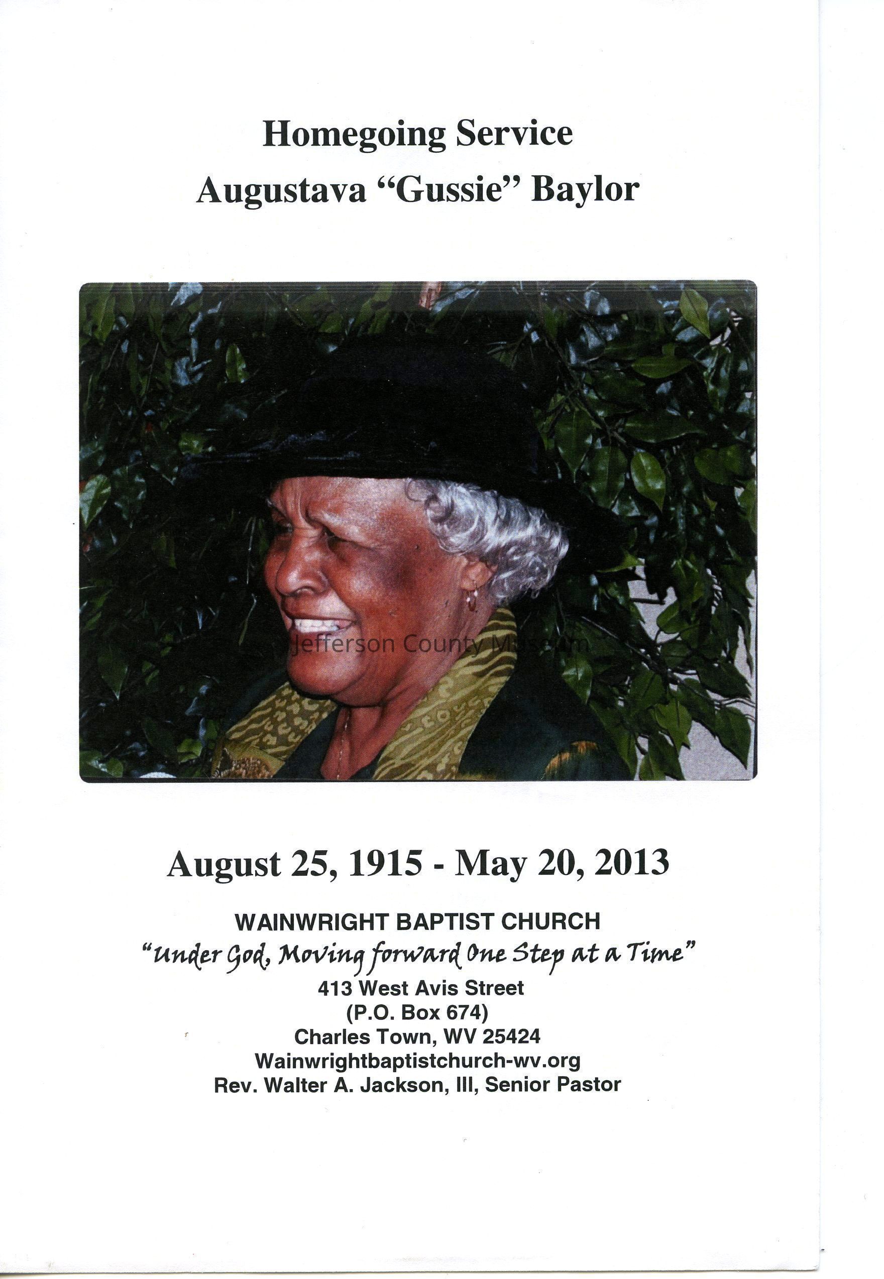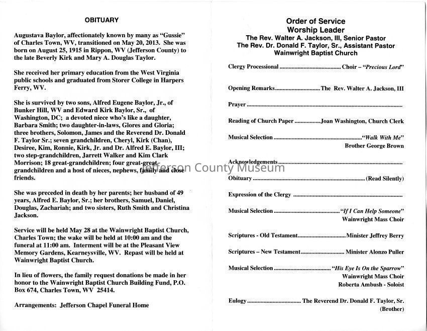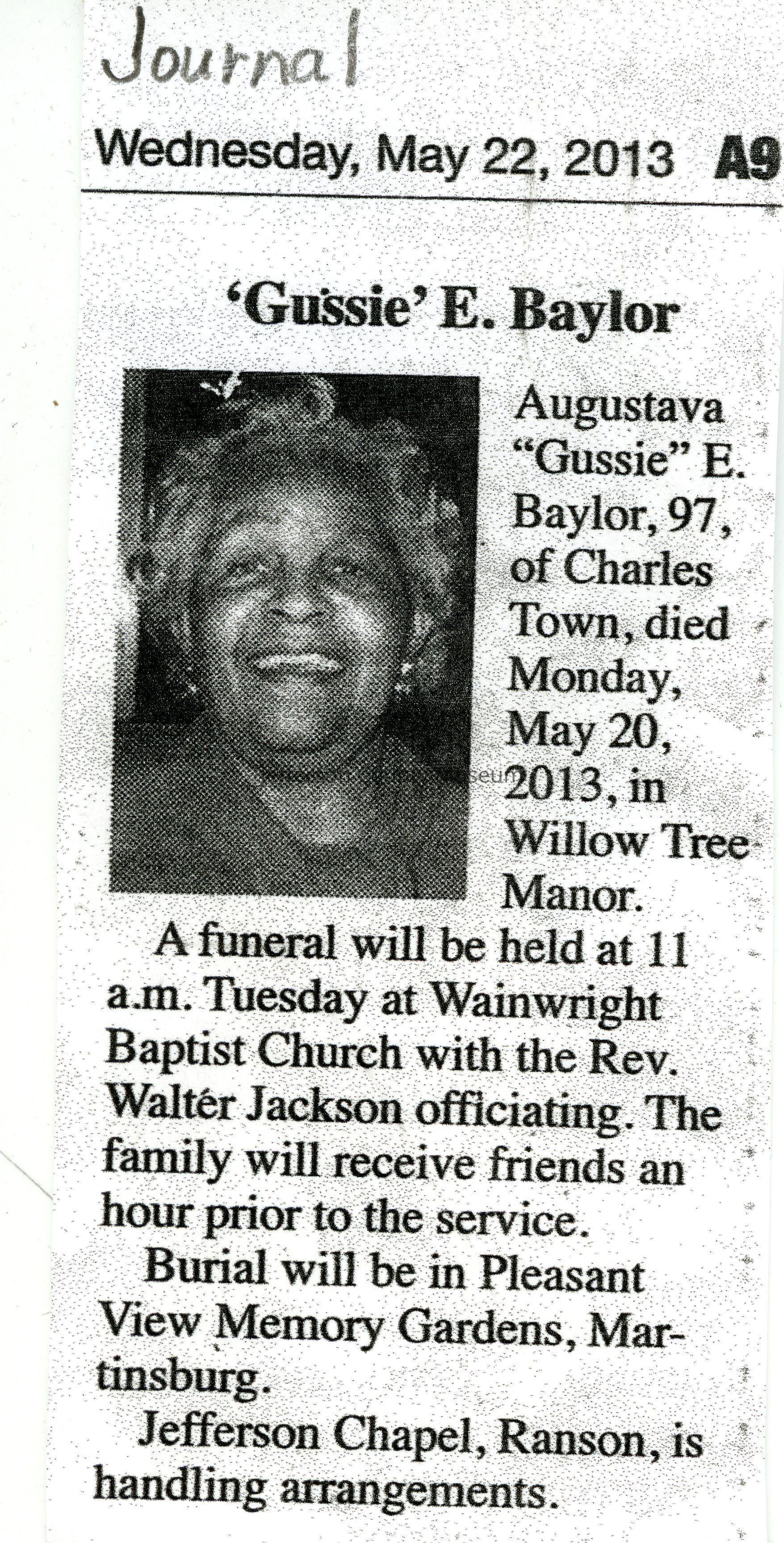 ARC755-4: Obituary of Augustava "Gussie" E. Baylor from the Journal (Martinsburg), May 22, 2013.