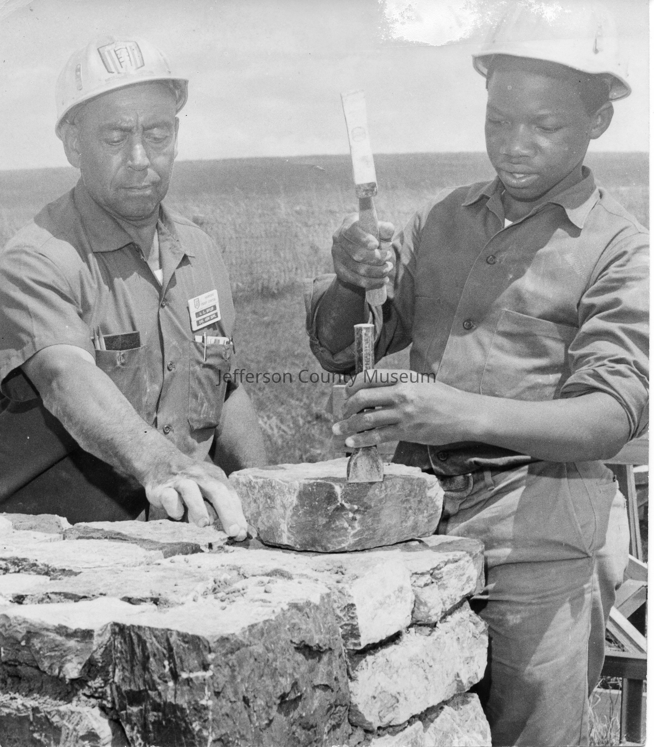 ARC755-6: Image of donor's father, Alfred Baylor, Sr., and Job Corpsman doing stone work at interpretive stop (Bloody Lane at Antietam National Battlefield, summer 1967.