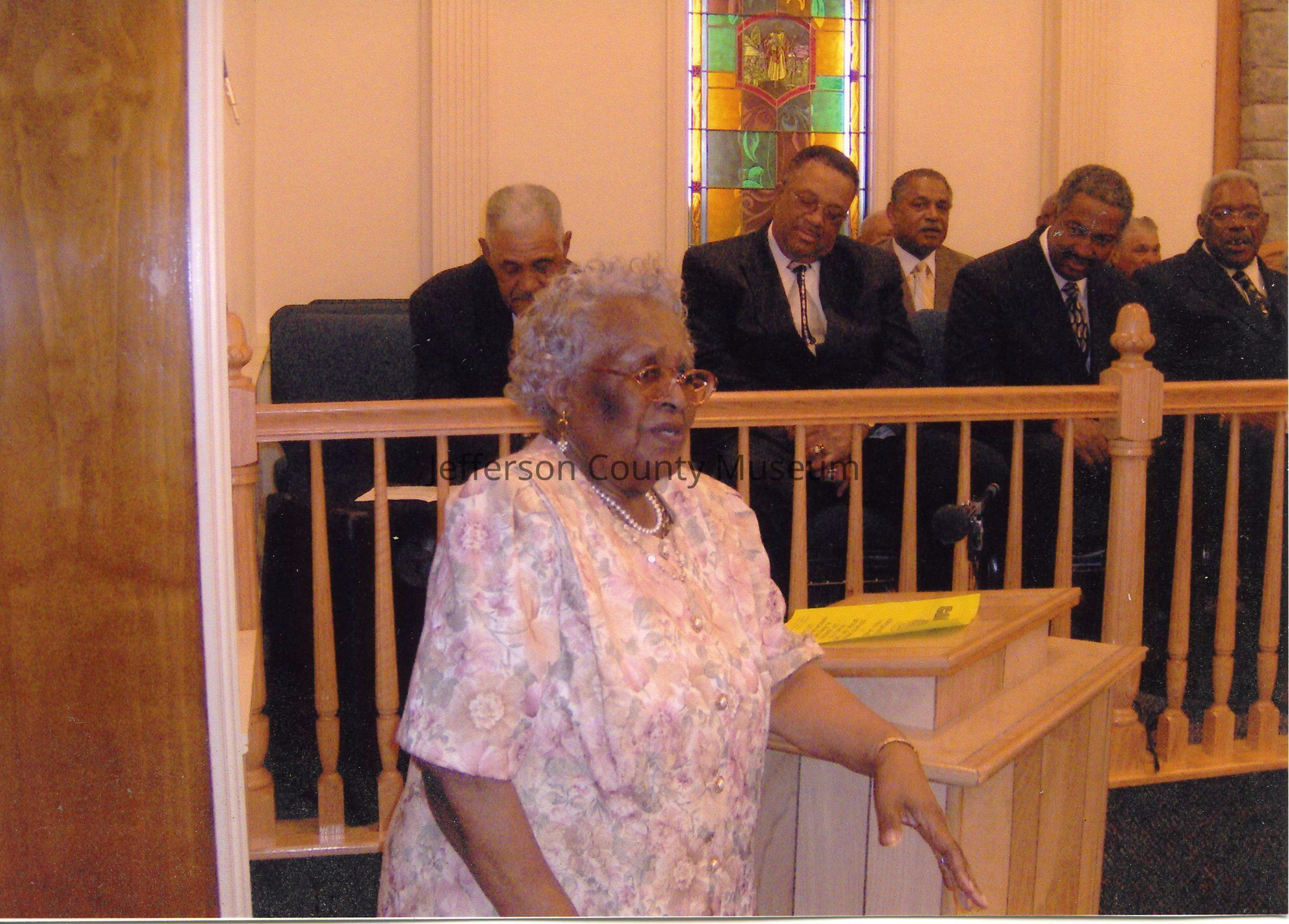 ARC755-7: Image of donor's mother, Augustava "Gussie" E. Baylor, at Wainwright Baptist Church. In the back, left to right: Deacon Earl Taylor, Deacon Elston Taylor, Alfred E, Baylor Jr., Selwyn Taylor, Russell Roper (partially hidden), Rev. J. D. Holland.Acquisition