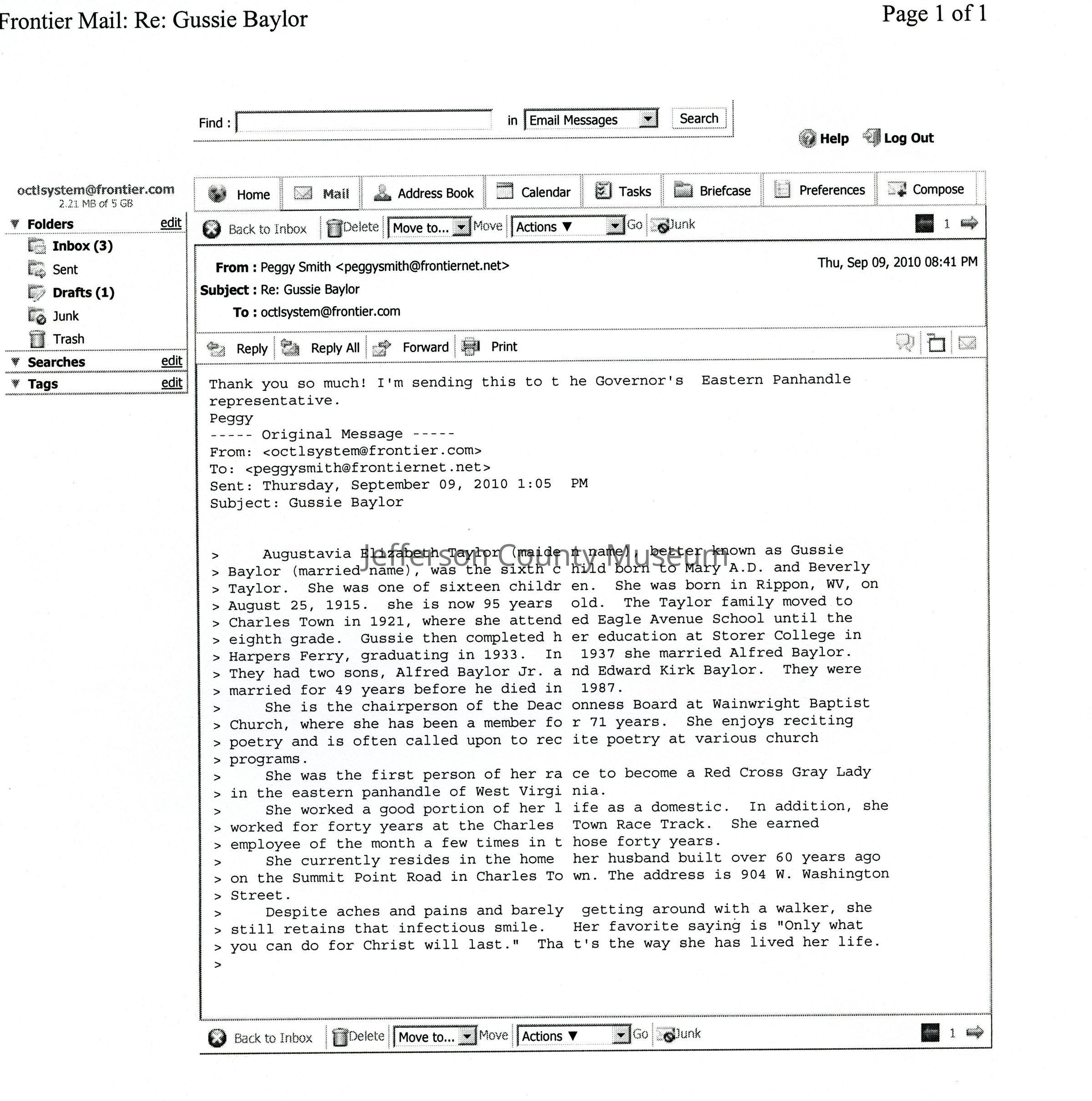 ARC755-1: Biography (e-mail from Peggy Smith), dated September 9, 2010.