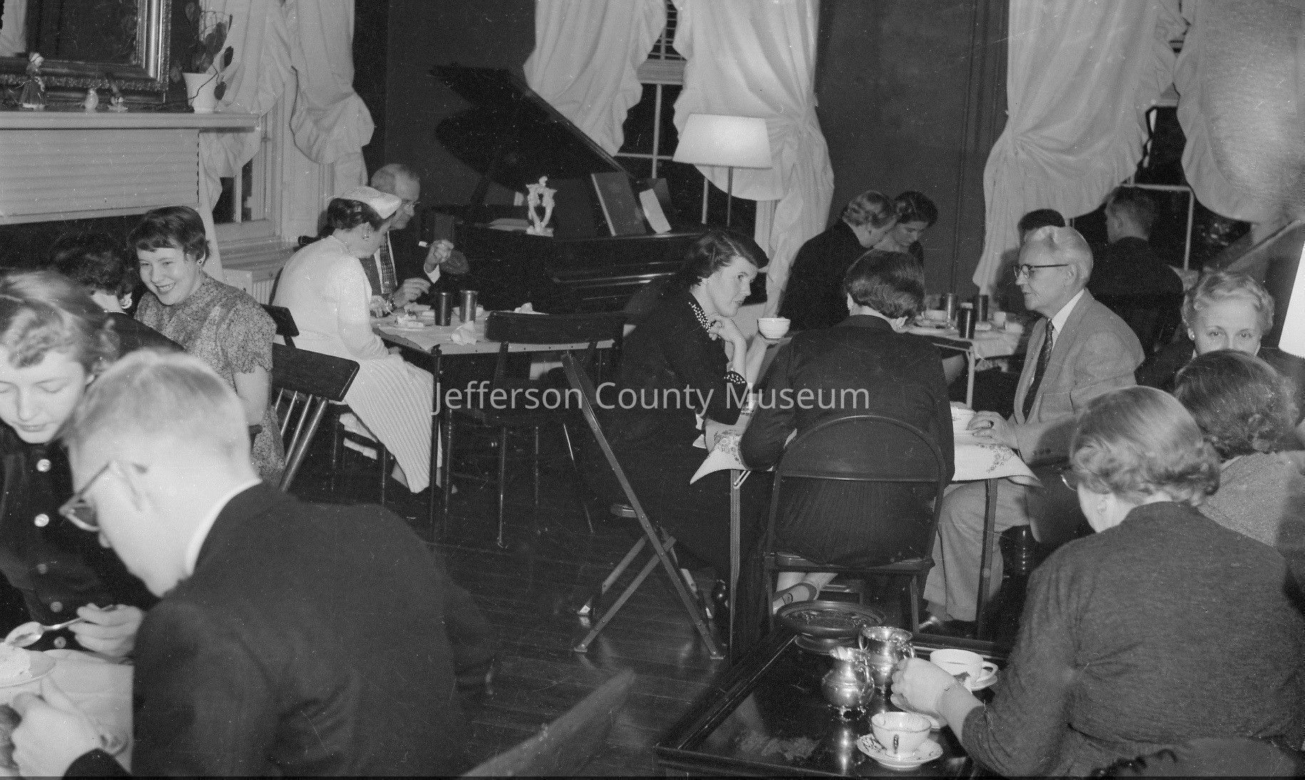 Interior of George William Myers, Jr. and Marian Merchant Myers’ house near Shepherdstown. Emely Merchant is in the dark green dress below the lamp. According to the donor, the photo may have been taken during a wedding reception and the man in the grey suit may be Hank Moler.