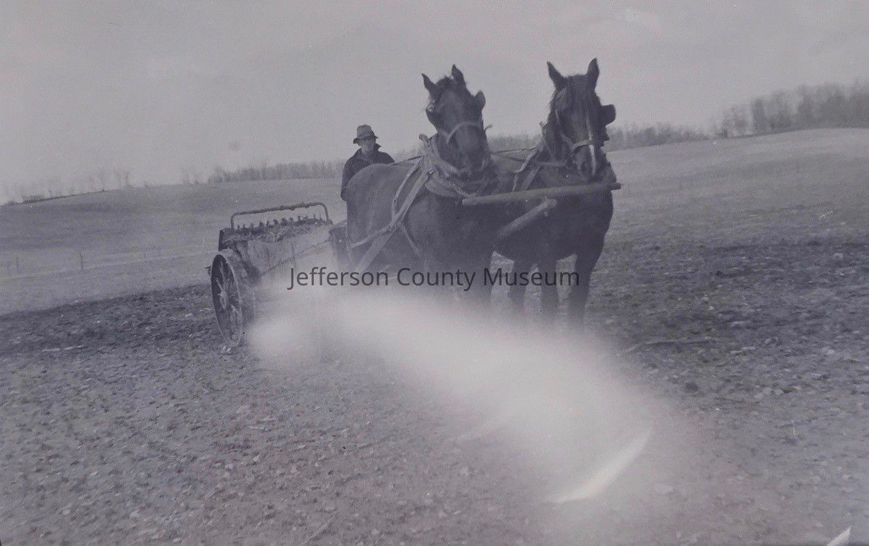 Oliver M. Merchant on a manure spreader at his and his wife's, Agnes Merchant, farm (also known as the Tackley Farm) in Bardane.