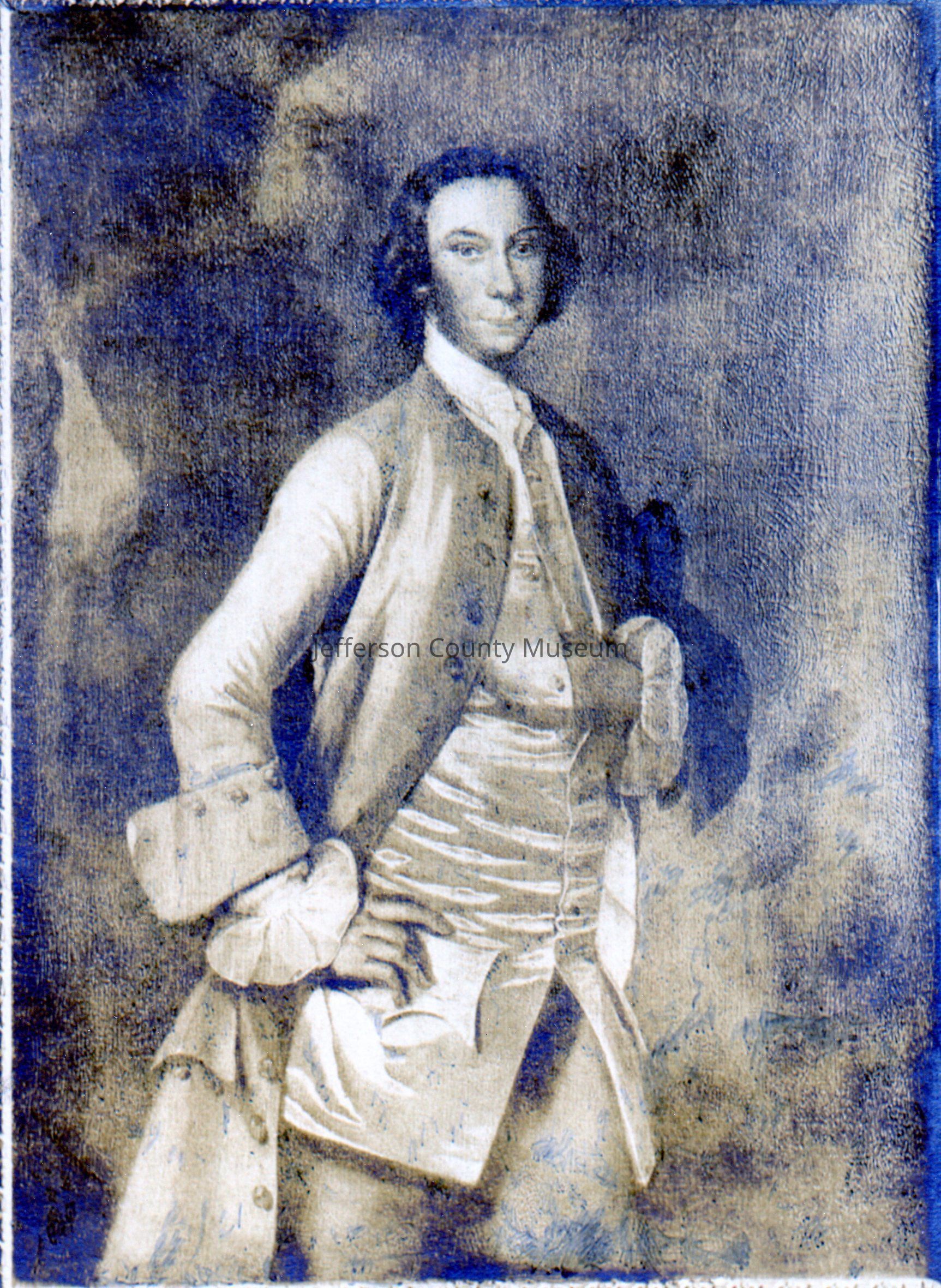 Sepia photo in black frame of Samuel Washington taken of painting that hangs in Harewood. Shows him standing with right hand at hip and left hand inside waistcoat. Red dymotape label says SAMUEL WASHINGTON.Acquisition