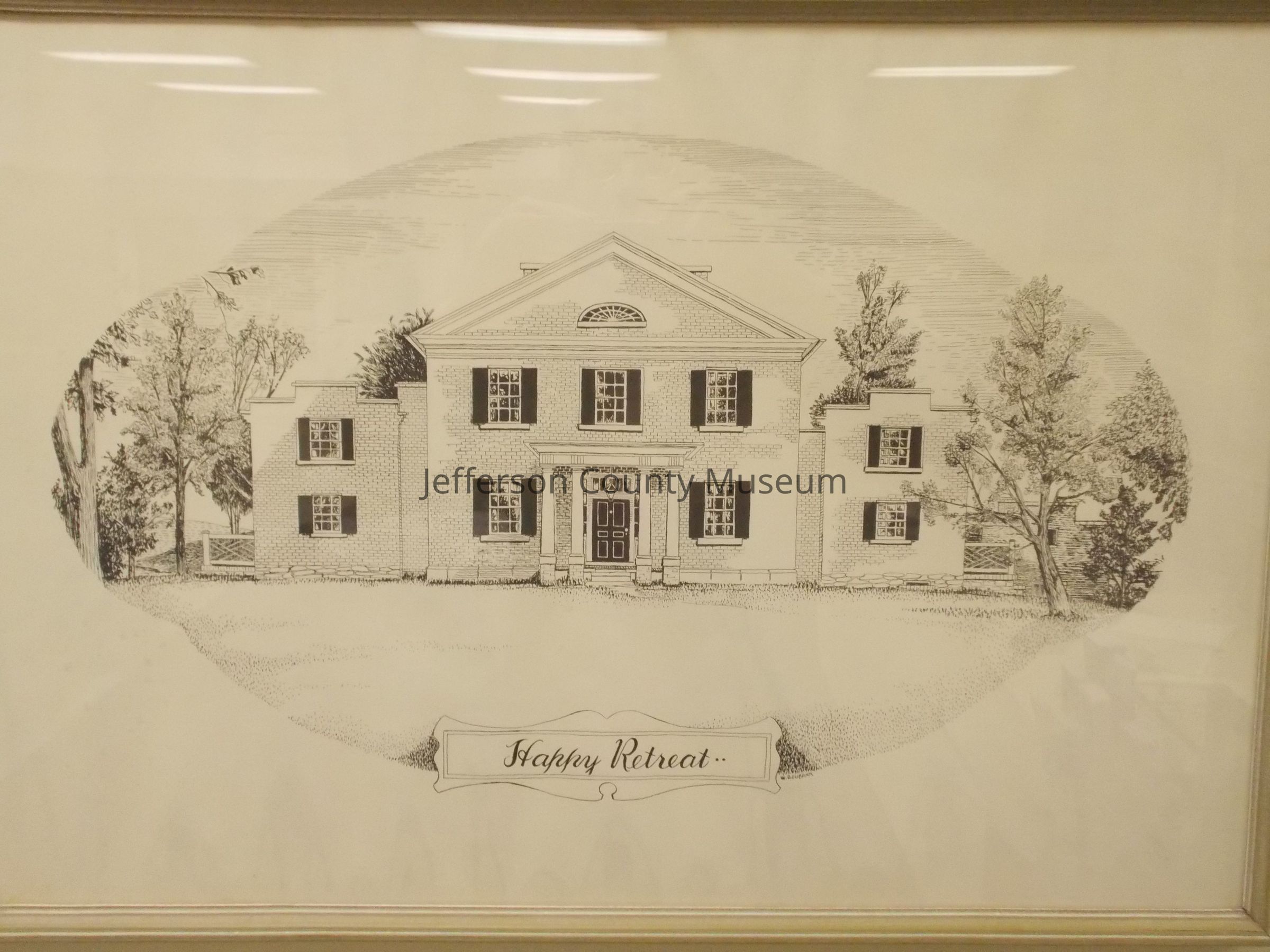 Black and white reproduction drawing in gray frame of Happy Retreat. At bottom "Happy Retreat". To right of that "W. D. EUBANK".