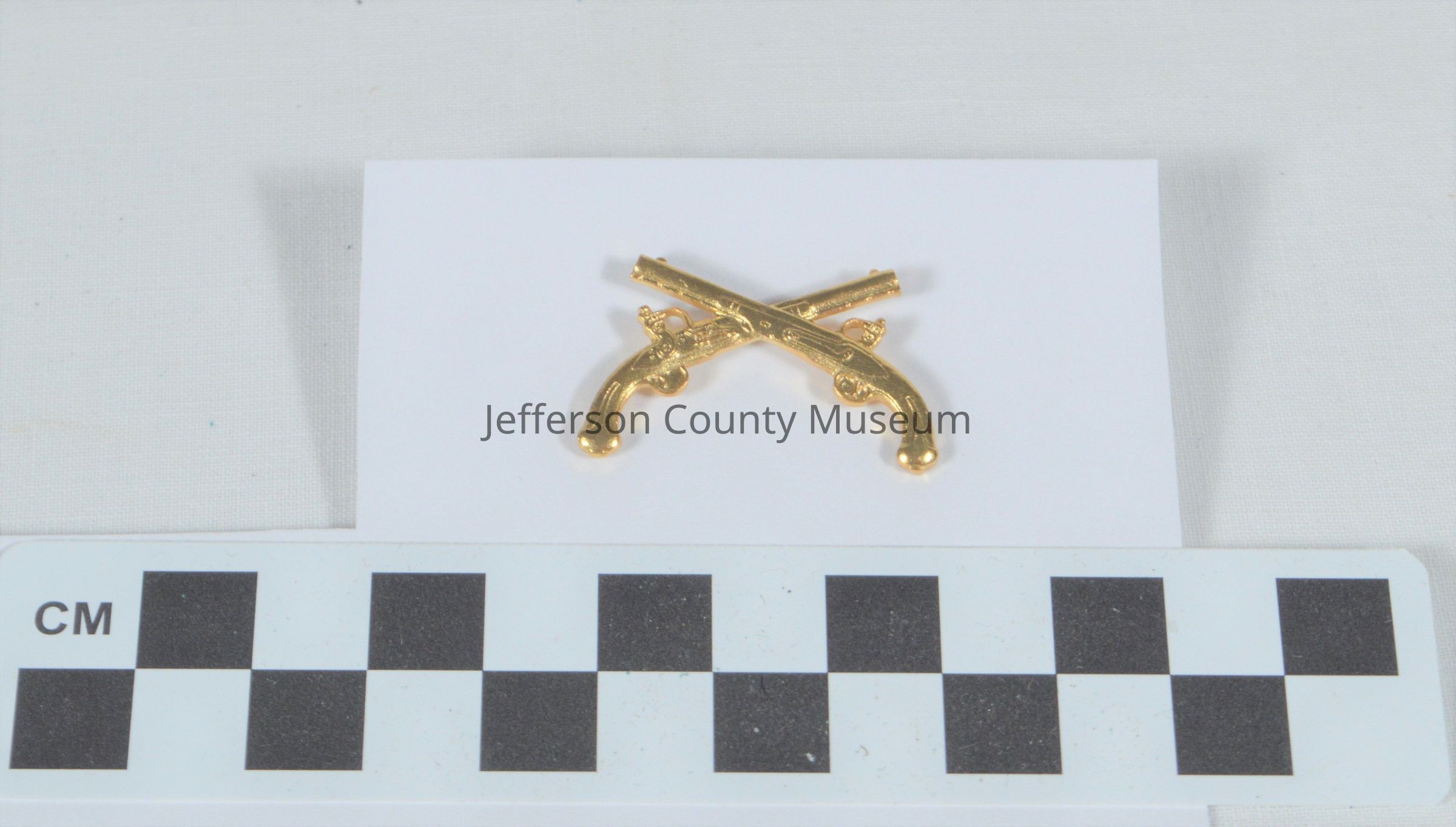 United States Military Police Corps insignia pin. Insignia features two crossed U.S. Model 1805 flintlock pistols. "L.I.G.I." embossed on back of pin. The insignia was approved in 1922. The U.S. Model 1805 flintlock pistol manufactured at Harpers Ferry Armory was selected for the insignia because it was the first U.S. military pistol and remained the Army model for many years.Acquisition