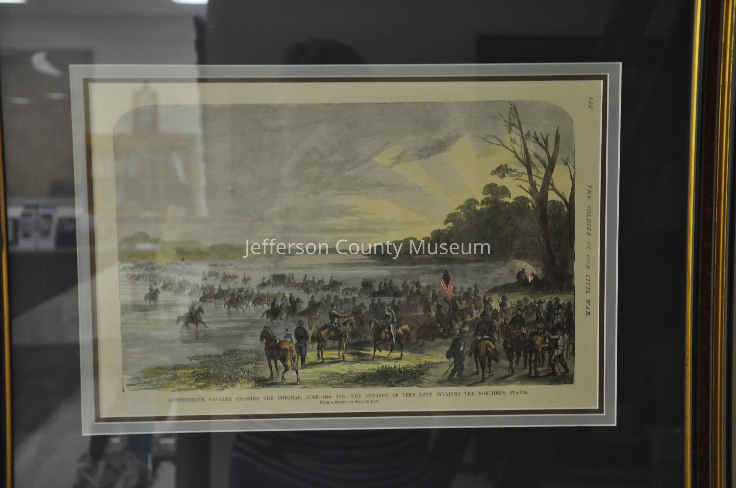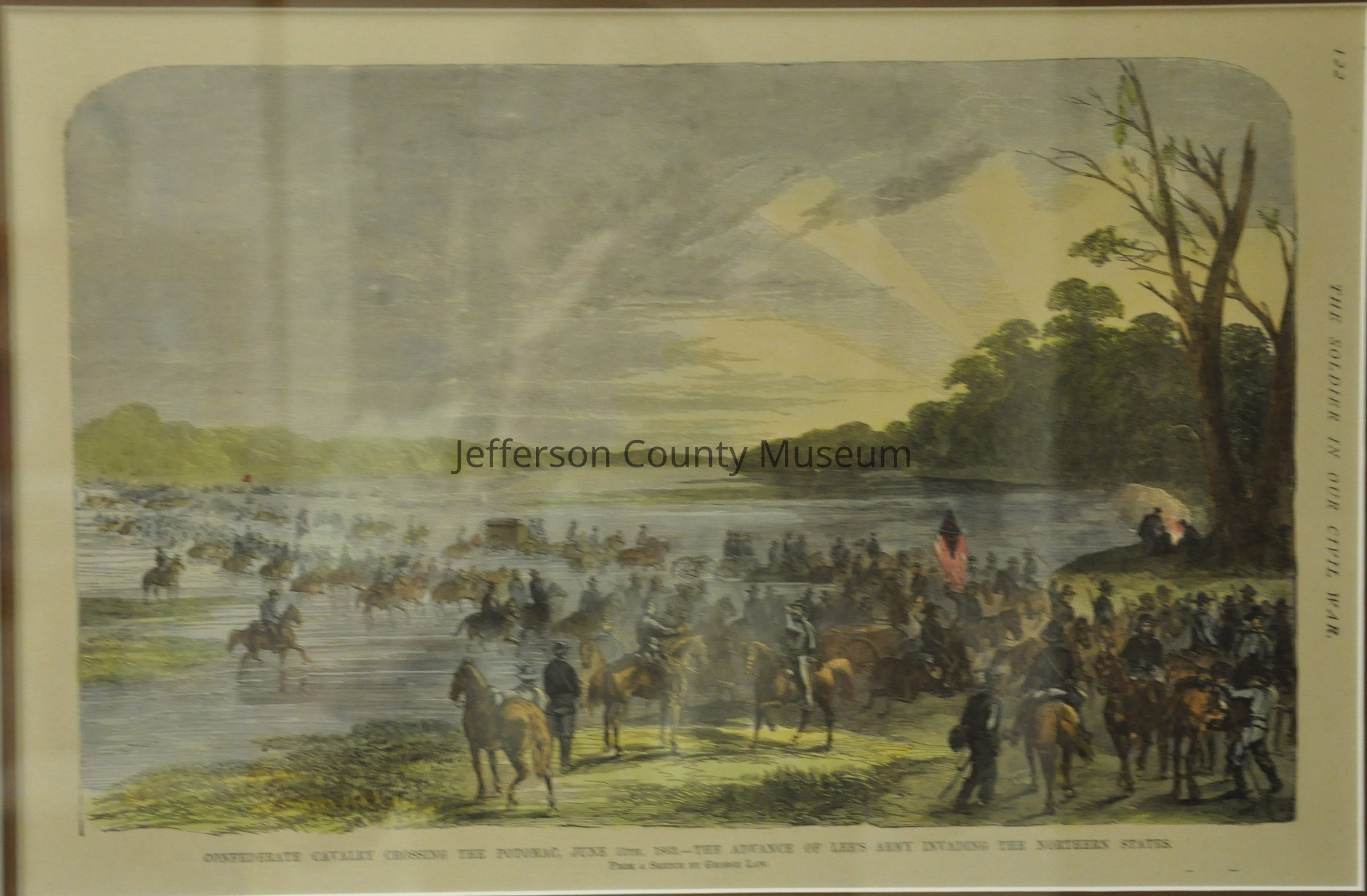 Title at bottom: CONFEDERATE CAVALRY CROSSING THE POTOMAC, JUNE 11TH, 1863 - THE ADVANCE OF LEE'S ARMY INVADING THE NORTHERN STATES. FROM A SKETCH BY GEORGE LAW. At right: 122 THE SOLDIER IN OUR CIVIL WAR. From Harper's Weekly. Framed and matted.Acquisition