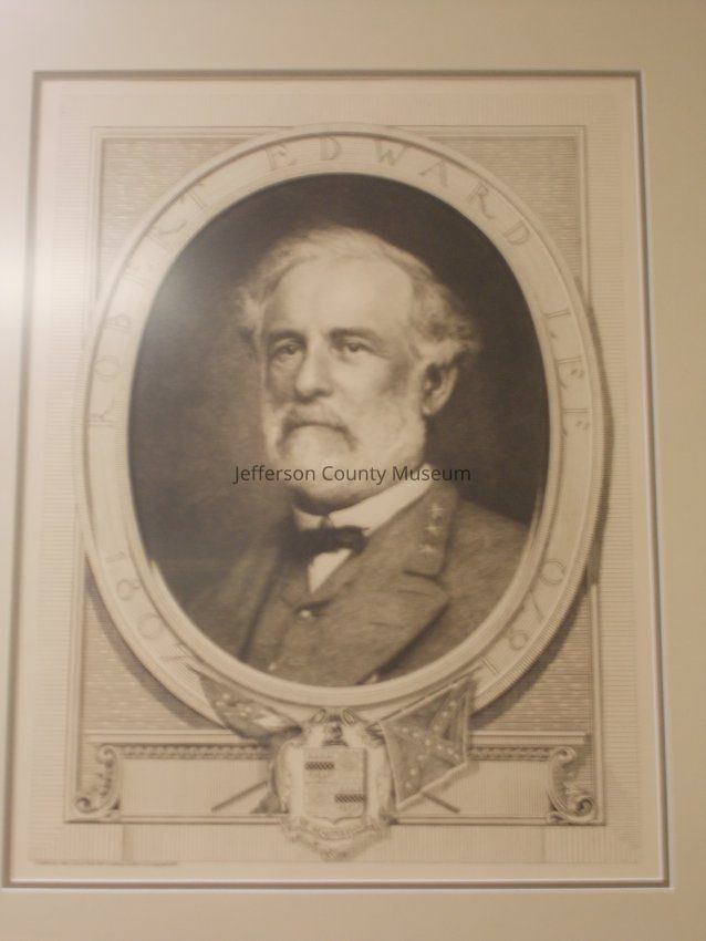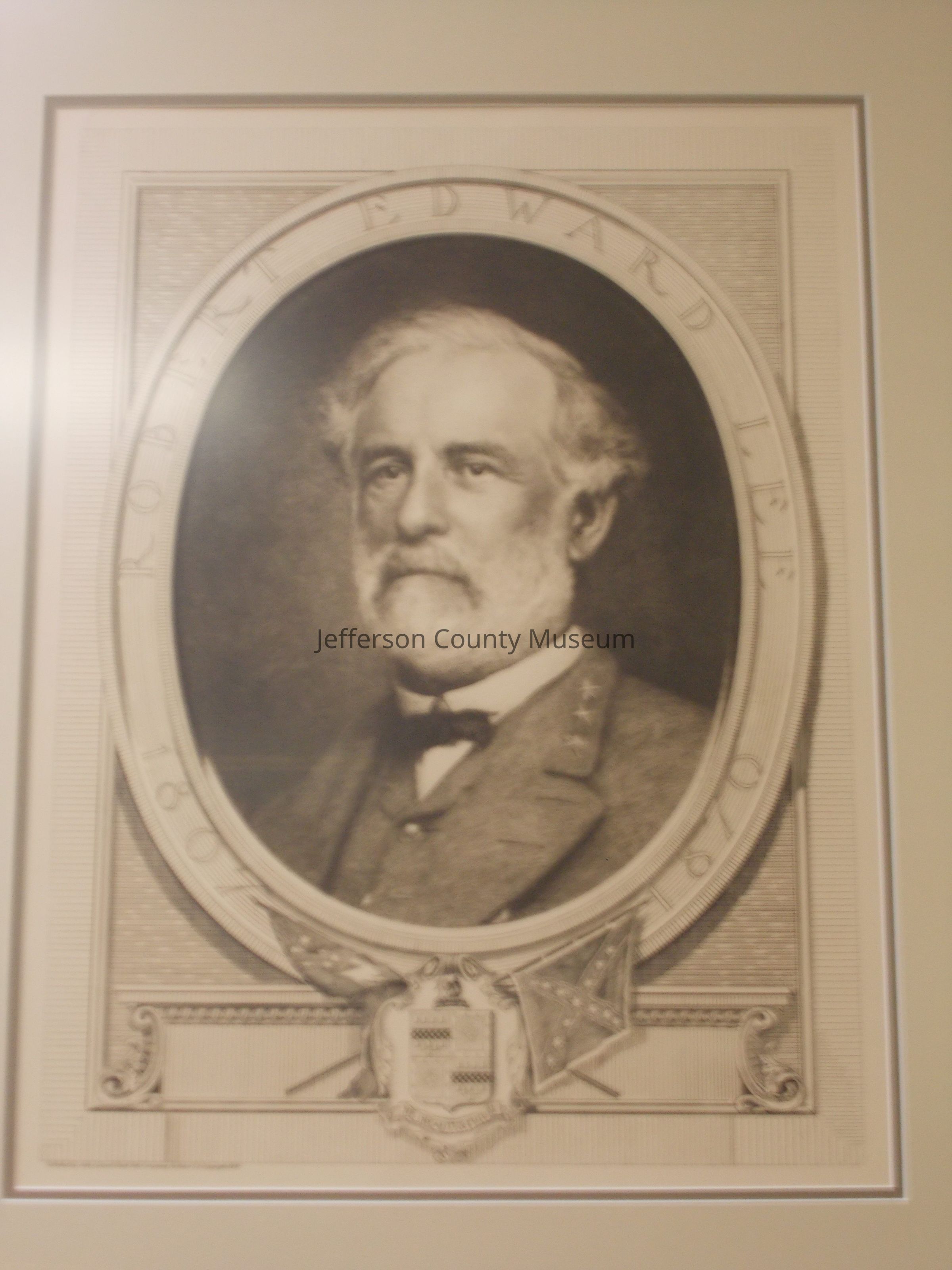 Robert E. Lee. At top and half way around oval: ROBERT EDWARD LEE. At bottom of oval: 1807 1870. Crossed Confederate flags and Lee crest below oval. At bottom left below engraving: Published by John A. Lowell, Bank Note Company, Boston, U.S.A. Copyright 1906. In gold tone frame.Acquisition