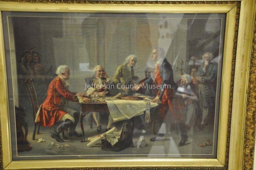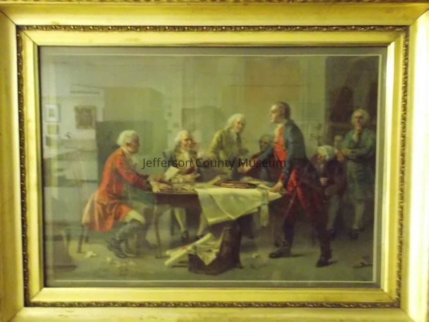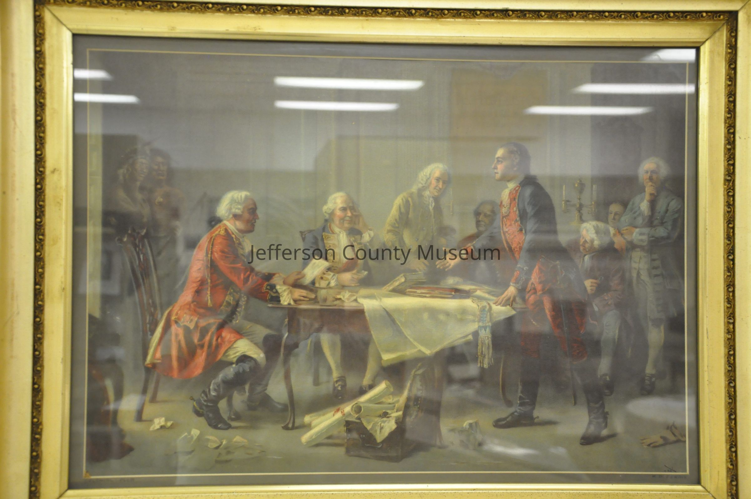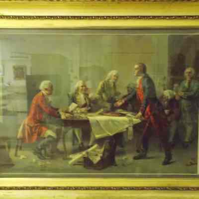 Titled COLONIAL PLEA by Louis Prang, original painting by Jean Leon Gerome Ferris. Depicts a young George Washington speaking before a British officer and Lord Fairfax during the French and Indian War. Two native Americans in background on left. In large gold toned frame.Acquisition
