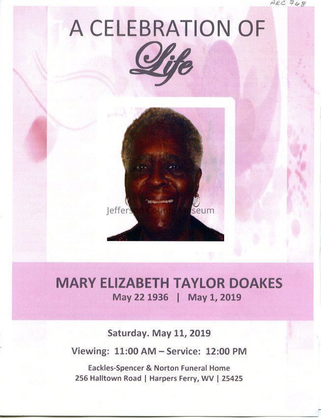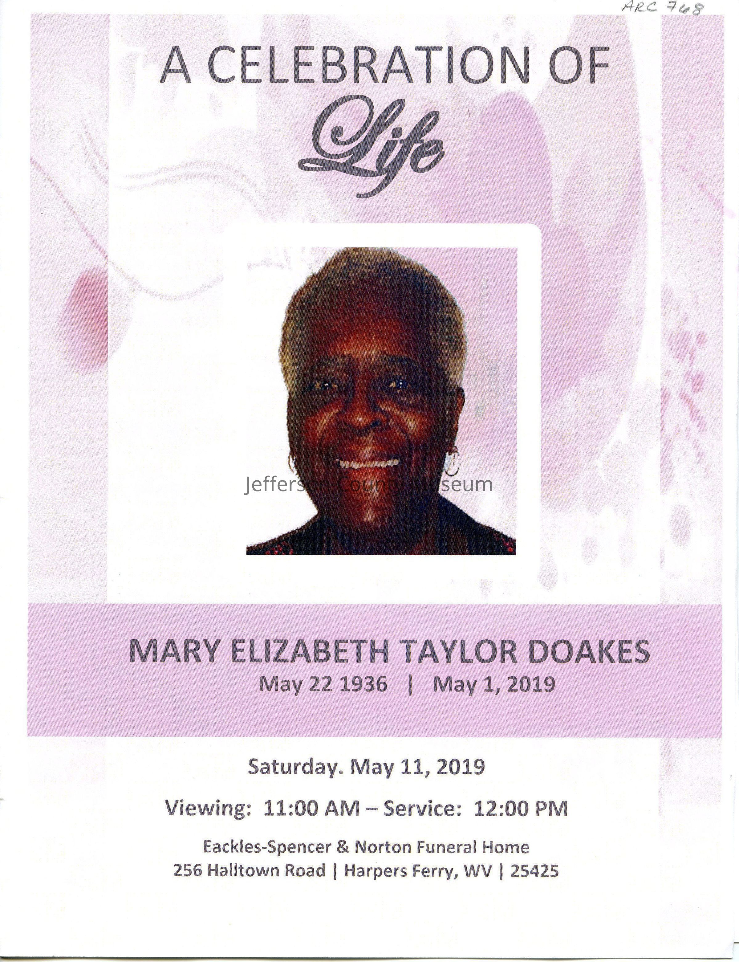 A Celebration of Life for Mary Elizabeth Taylor Doakes. Saturday, May 11, 2019 at Eackles-Spencer & Norton Funeral Home. Four pages of Order of Service, obituary, and photos.Acquisition