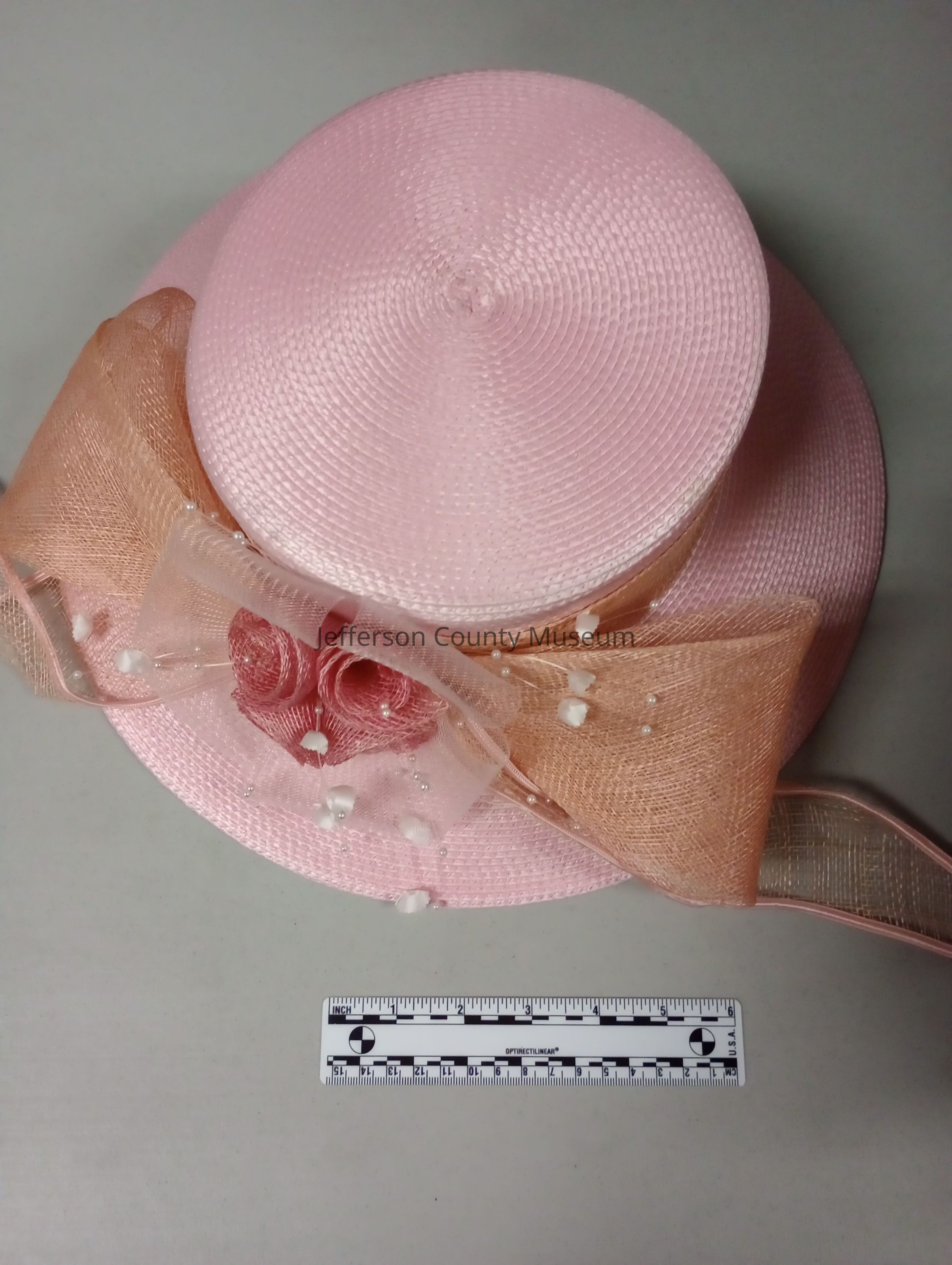 Light pink straw church hat with pink ribbon wrapped around the middle. The ribbon makes a large bow along one side with four pink ribbon flowers nestled in the center and pearl beaded strands. "Mr. Hi's Classic" brand. Owned by African American Harpers Ferry resident Delores Jackson Foster.Acquisition