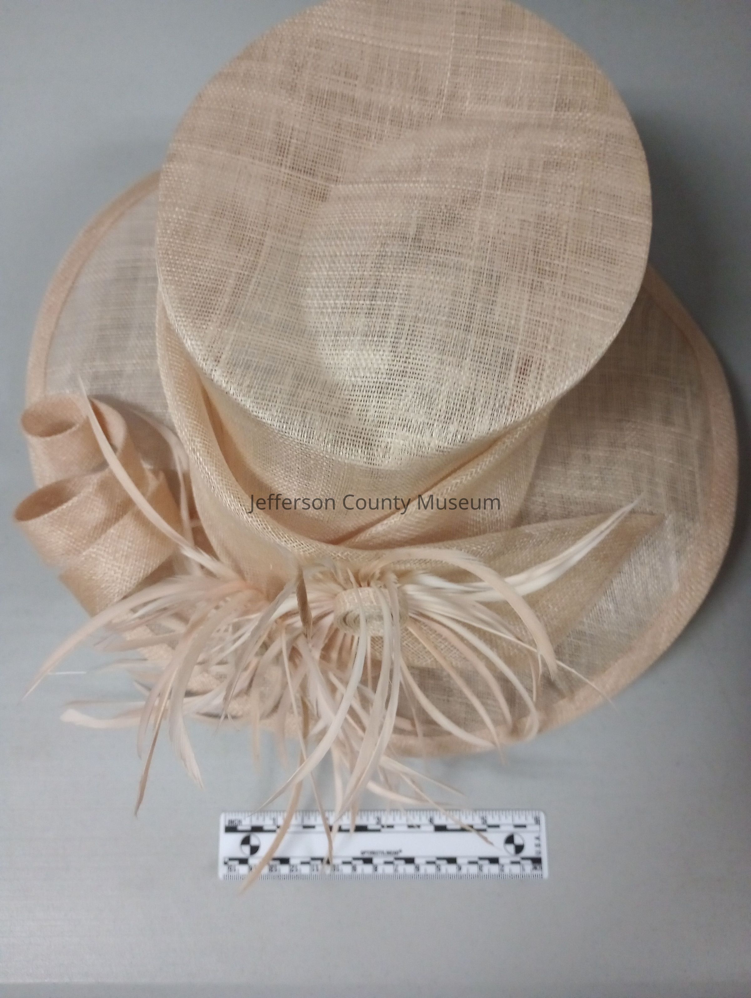 Beige sinamay church hat with two flowers along one side made from sinamay and feathers. Sinamay curl next to the flowers. Owned by African American Harpers Ferry resident Delores Jackson Foster.Acquisition