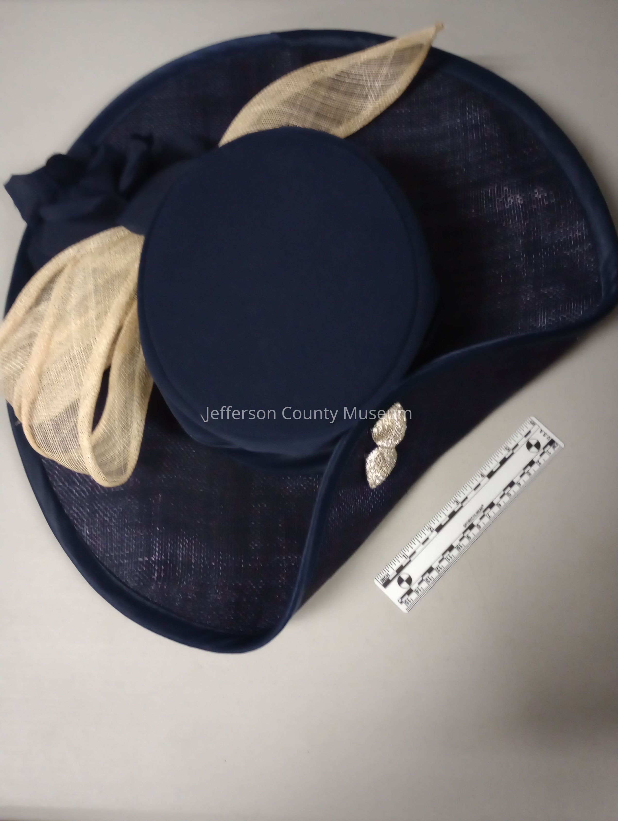 Navy blue sinamay church hat with half folded brim held by silver fasciner. Top and middle of hat is covered in navy blue fabric. On one side of the hat is a beige sinamay ribbon and blue fabric flower. "Elite Champagne" brand. Owned by African American Harpers Ferry resident Delores Jackson Foster.Acquisition