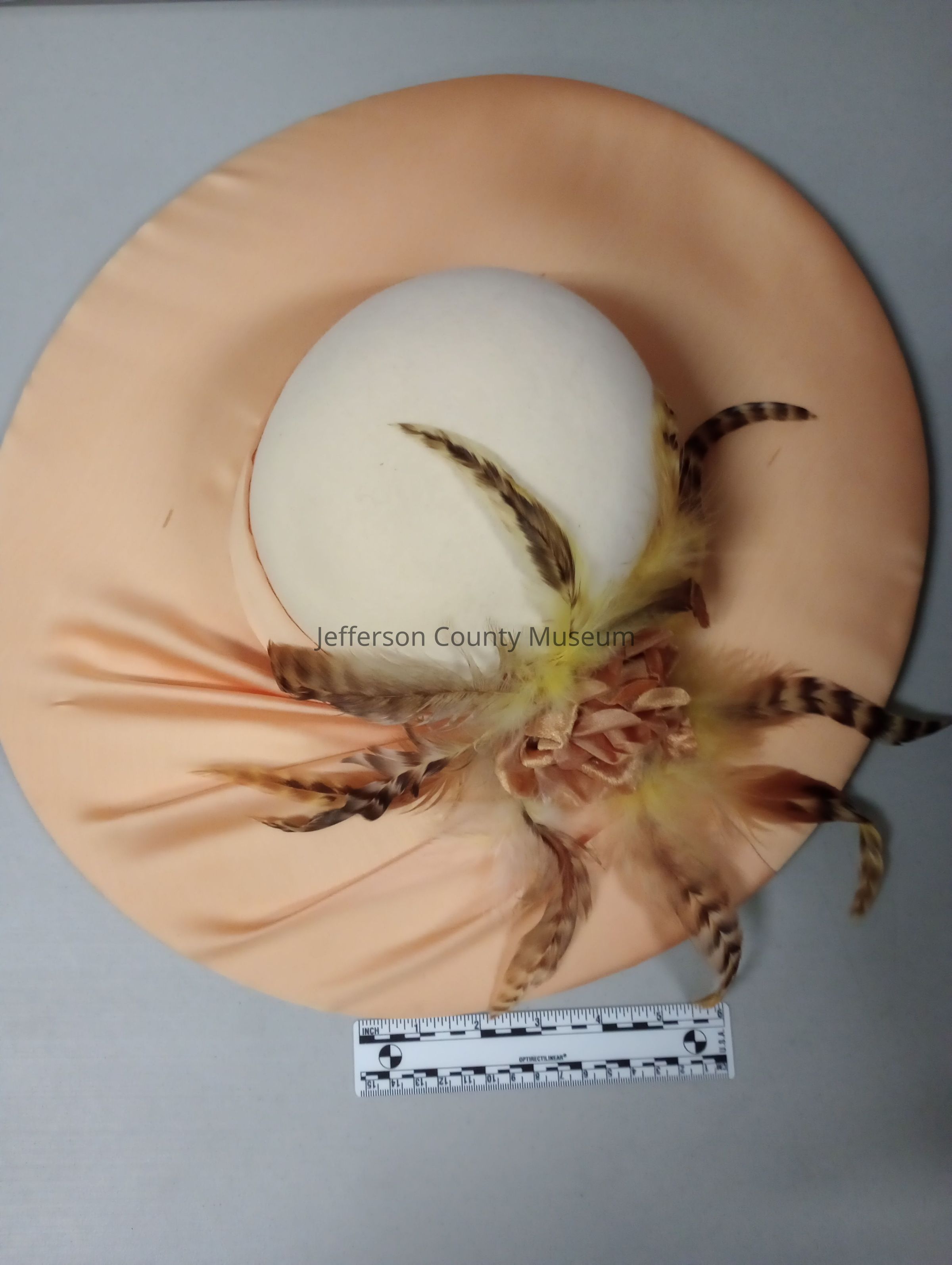 Light yellow felt church hat with middle and brim covered in yellow silk. On one side of the hat is a brown fabric flower surrounded by brown speckled feathers. On the underside of the brim is a white curl design. "Mr. Hi's Classic" brand. Owned by African American Harpers Ferry resident Delores Jackson Foster.Acquisition