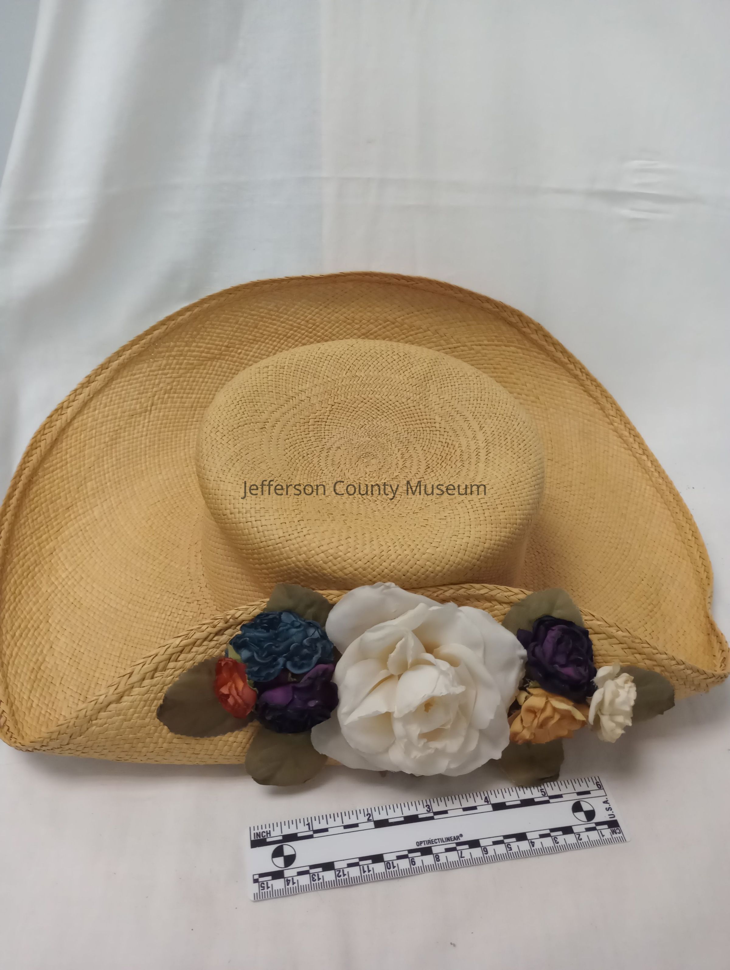 Yellow straw church hat with folded brim covered with fabric flowers. Large white flower in center. Smaller blue, red, purple, yellow, and white flowers with green leaves arranged to the left and right of large white flower. Owned by African American Harpers Ferry resident Delores Jackson Foster.Acquisition