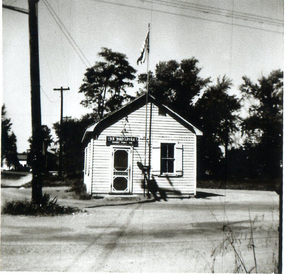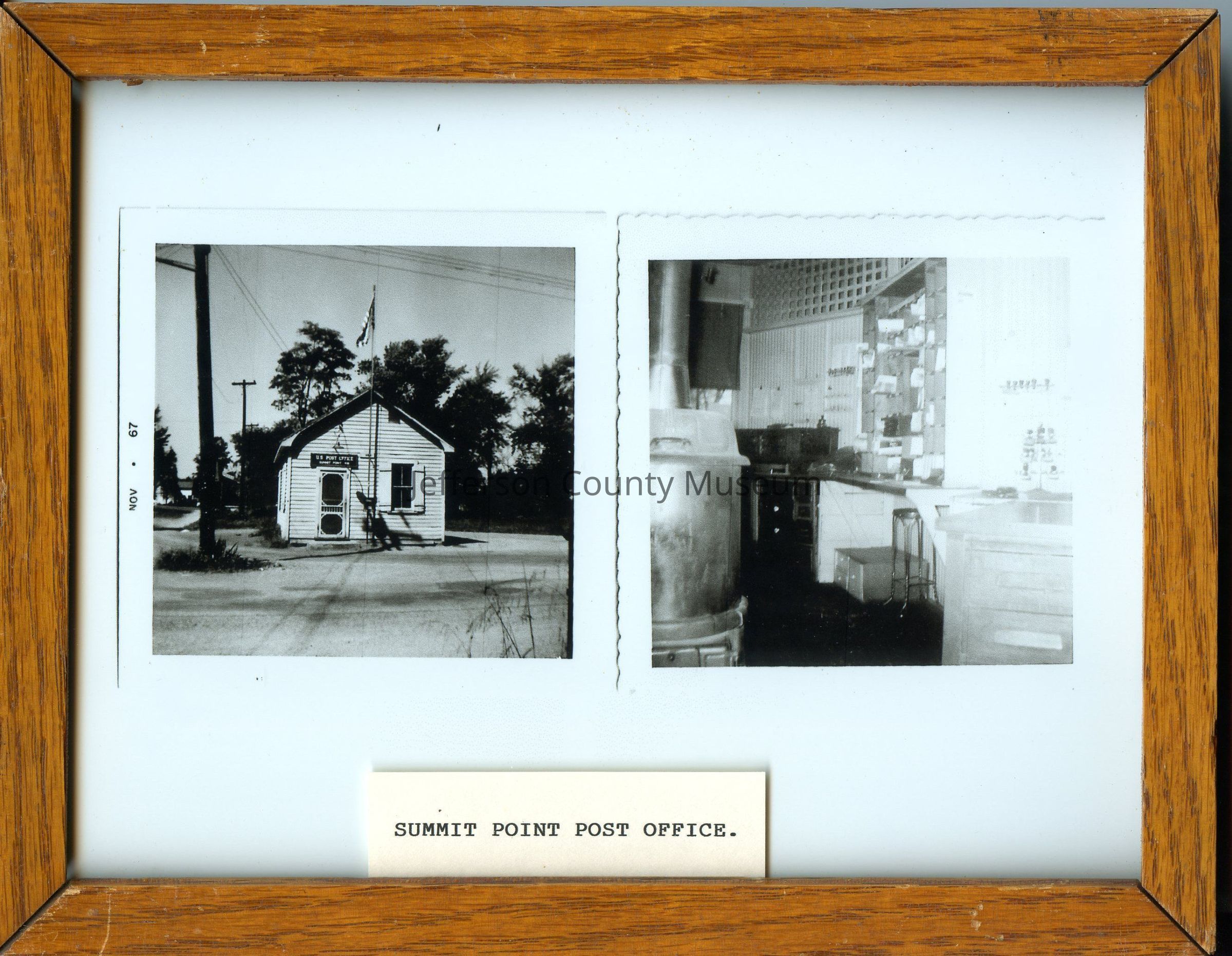 Two black and white photos framed together. One photo shows exterior of post office at Summit Point with flag flying on pole - photo taken November 1967. Second photo shows interior of post office. Back of the screenline of p.o. boxes is visible.Acquisition
