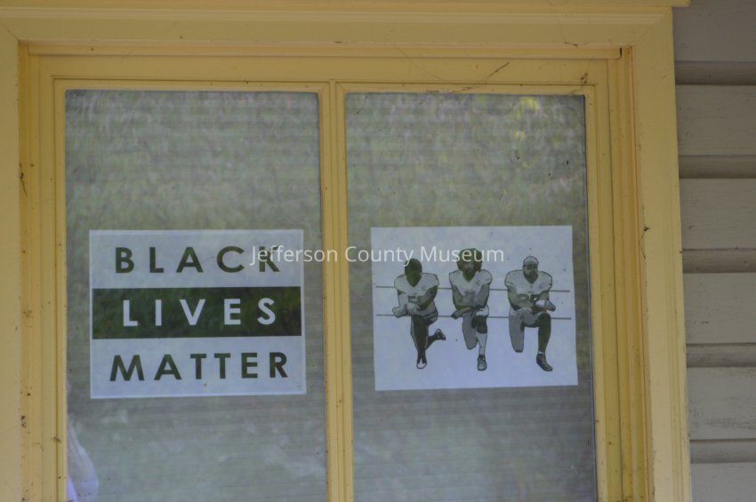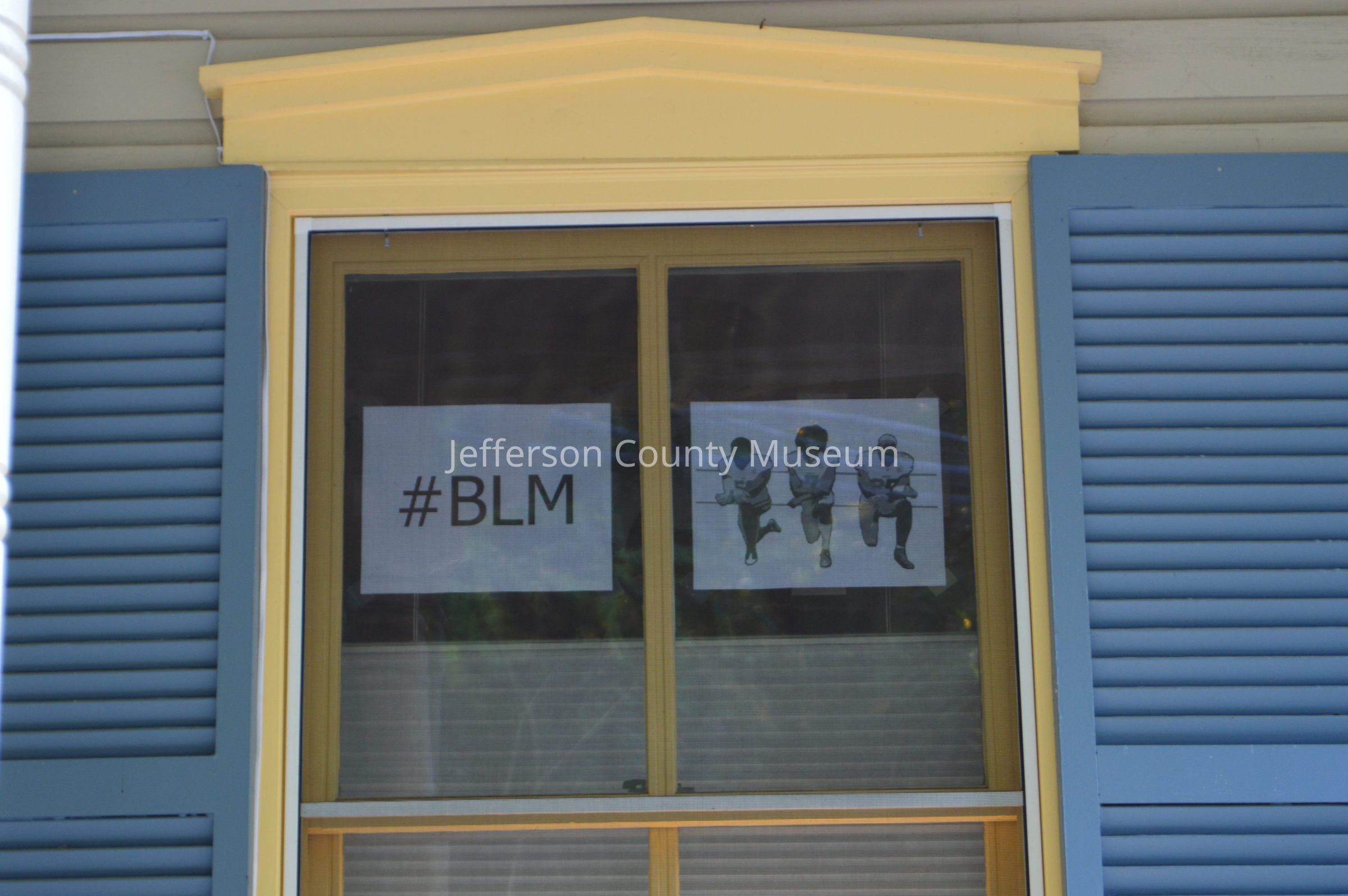 IMG3849002: "#BLM" text sign and sign with image of three African American football players kneeling in a window of a house in Harpers Ferry.
