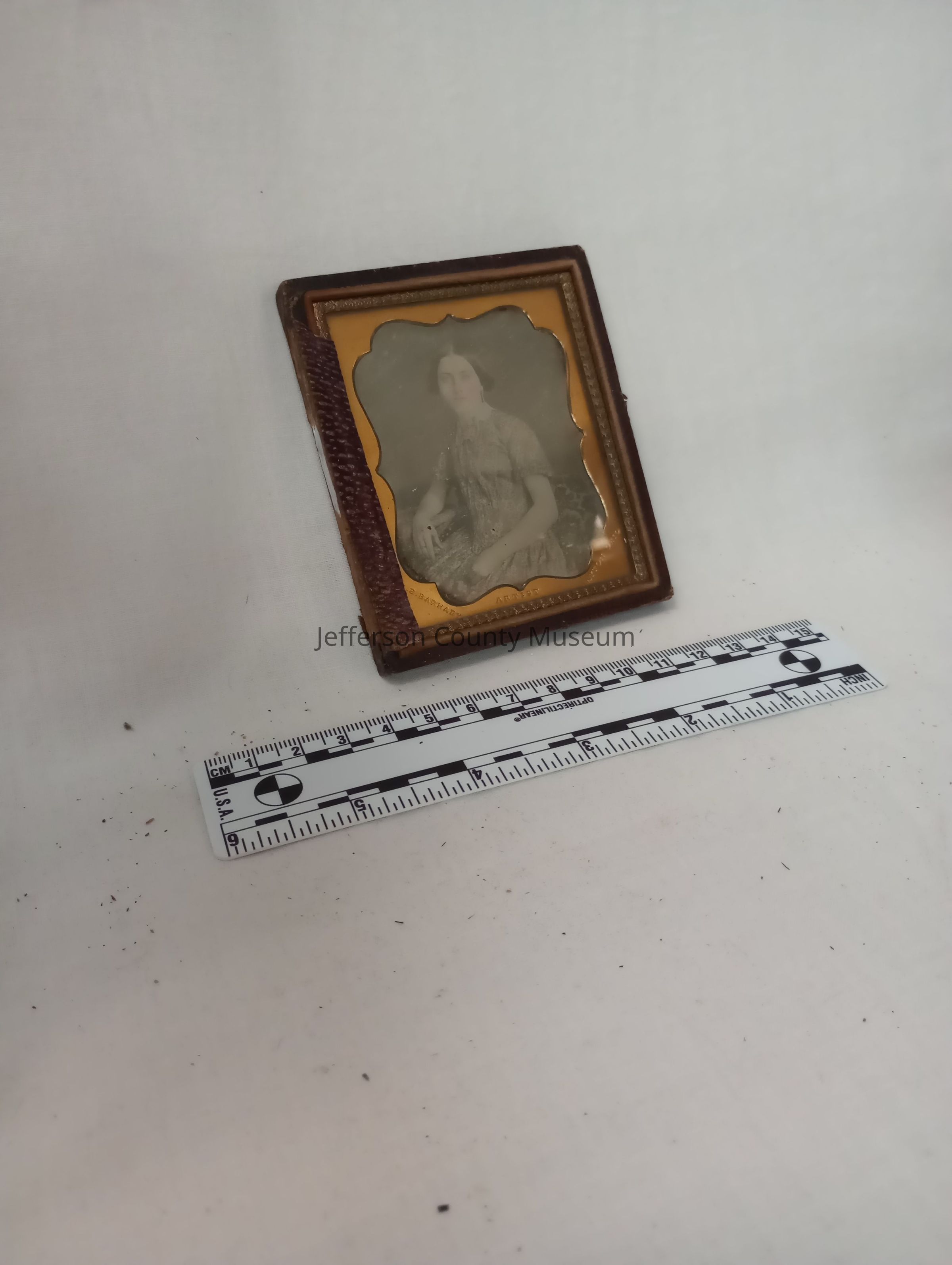 Daguerreotype of a seated woman wearing a floral short sleeved dress and seated on a flowered couch wearing earrings and a ring on her right hand. Ring, cheeks, lips, and a flower on the bow near her collar have all been tinted pink. Half of leather case for photo is missing. Below the photo, the frame is marked "S.B. BARNABY ARTIST DAYTON OHIO". Image was found by the donor at the Melvin Home at DuffieldsPhotograph Details