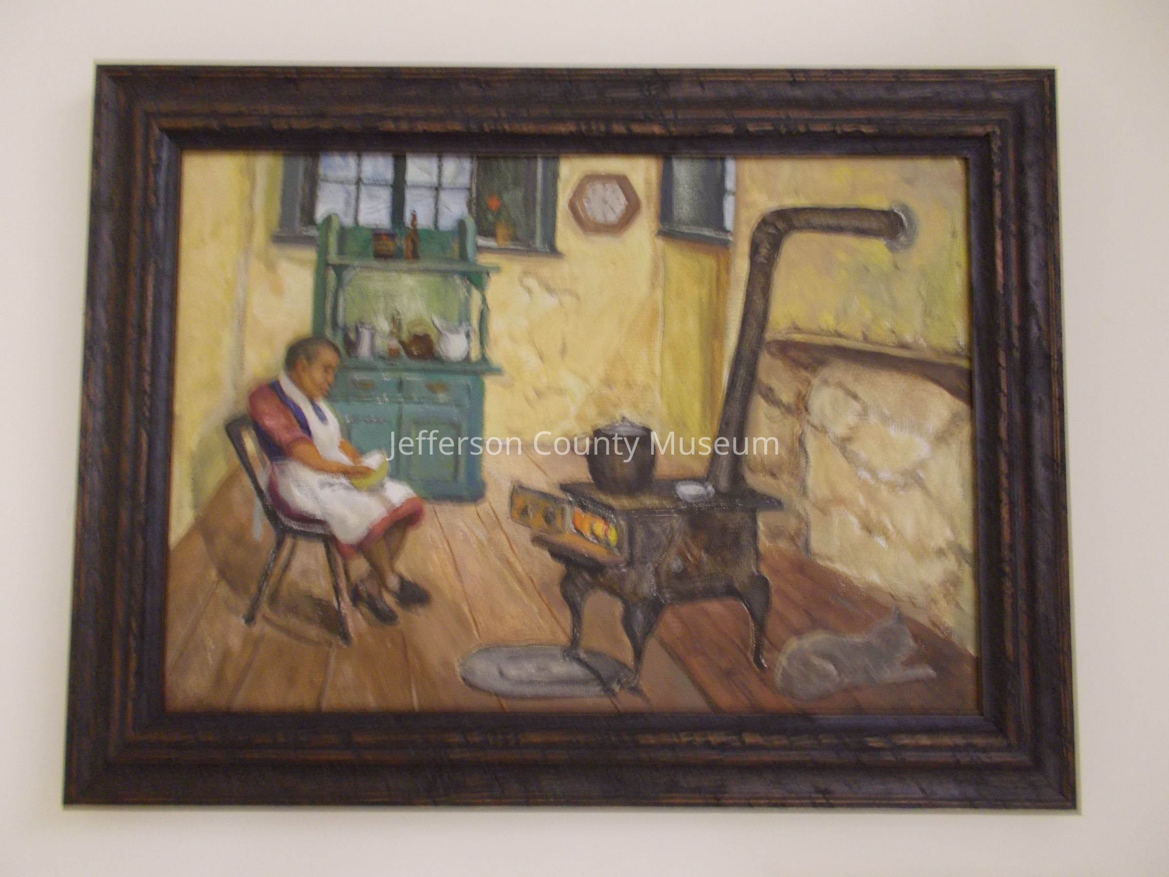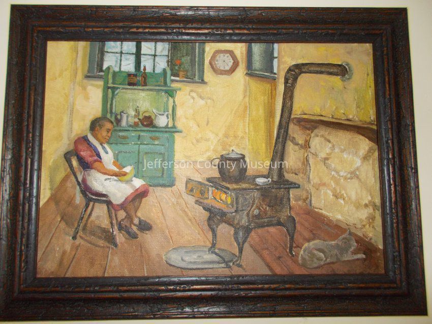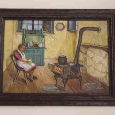Interior scene of African American woman mixing dough in a bowl, sitting in a chair by an open stove, gray cat sitting at side of stove.Acquisition