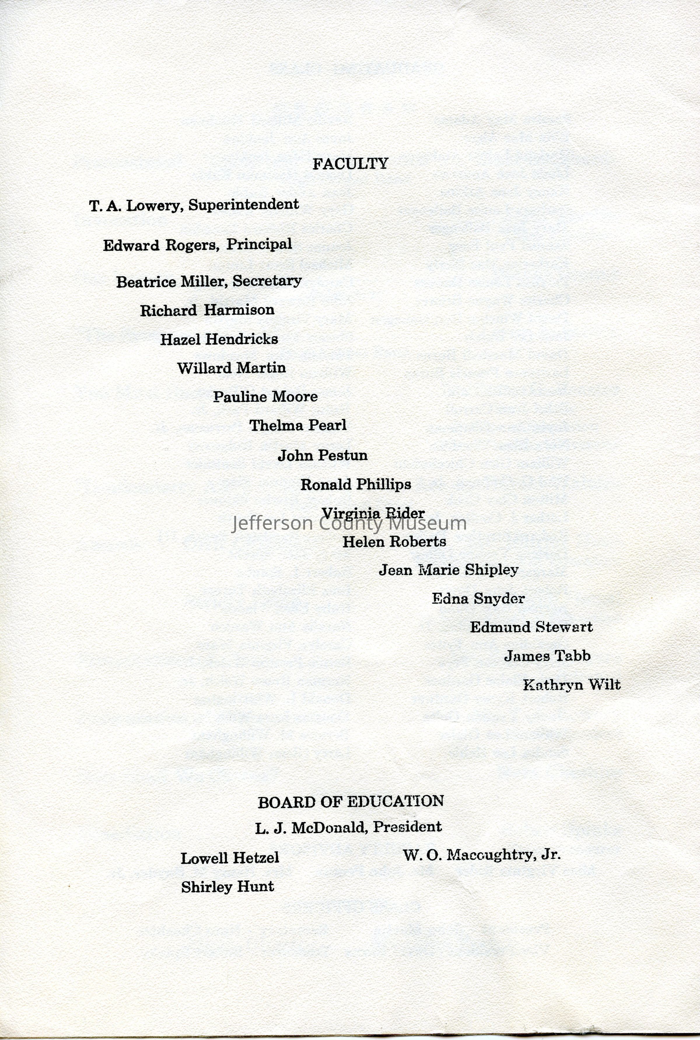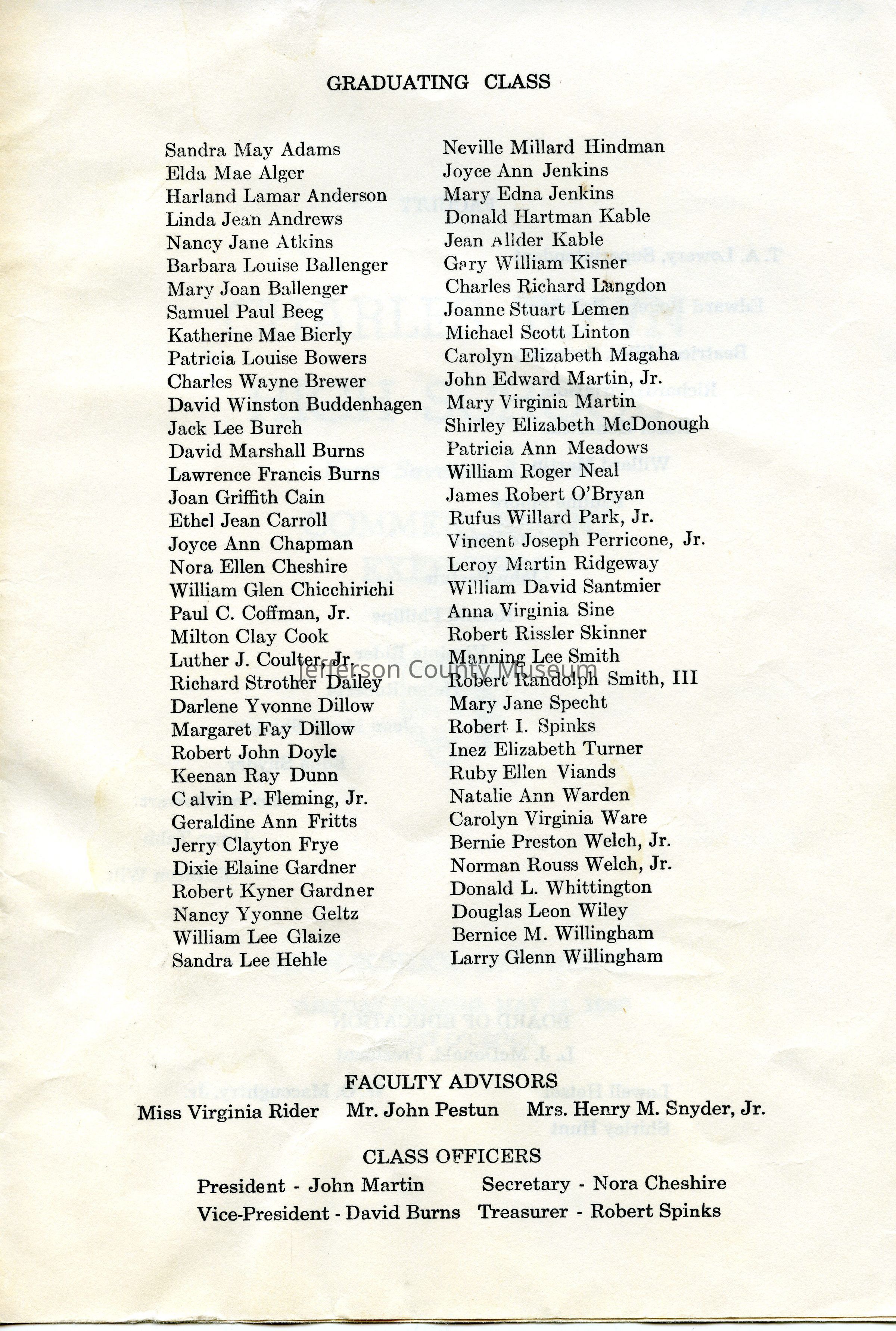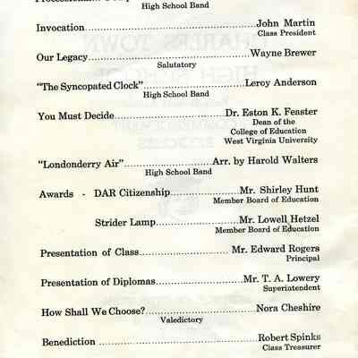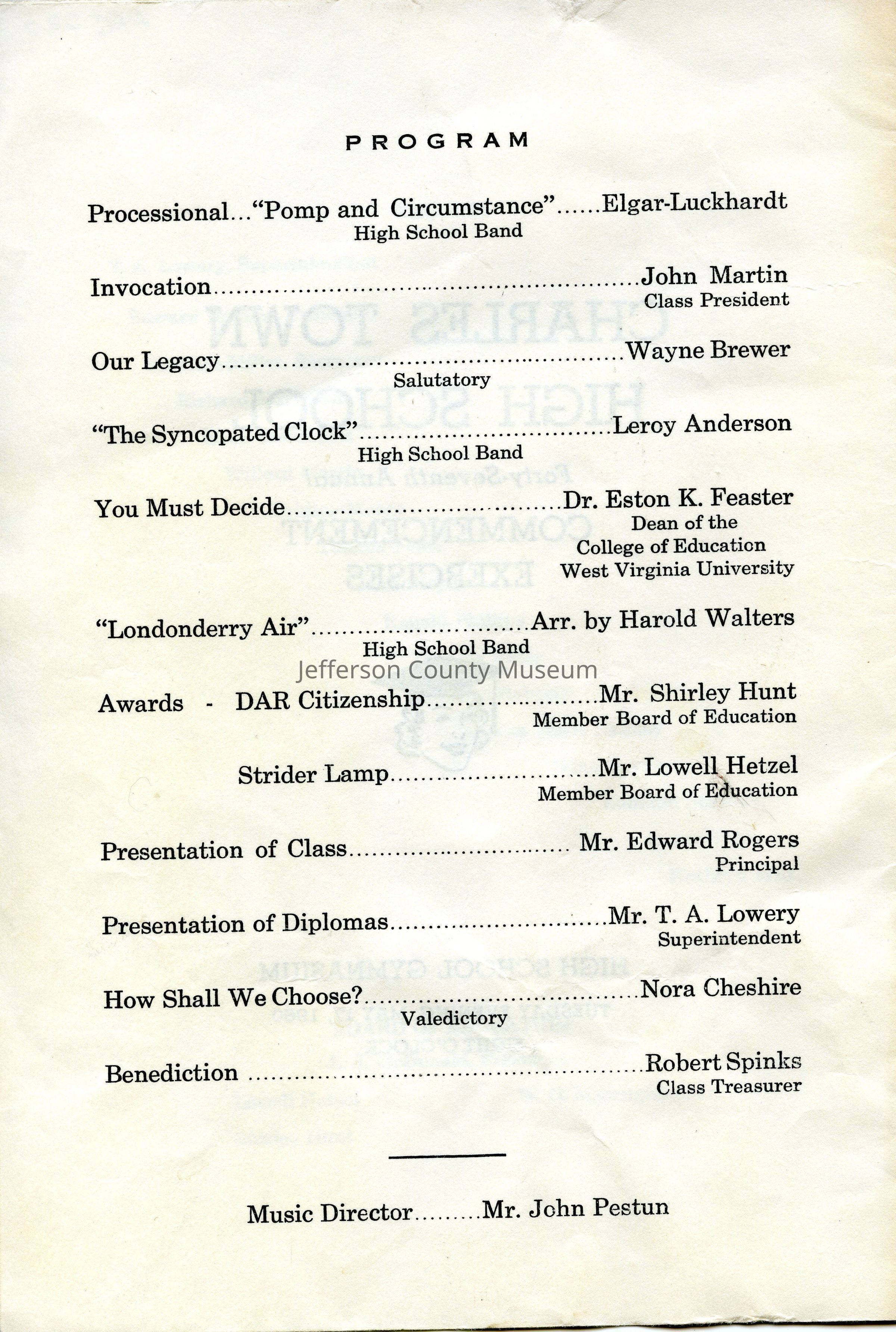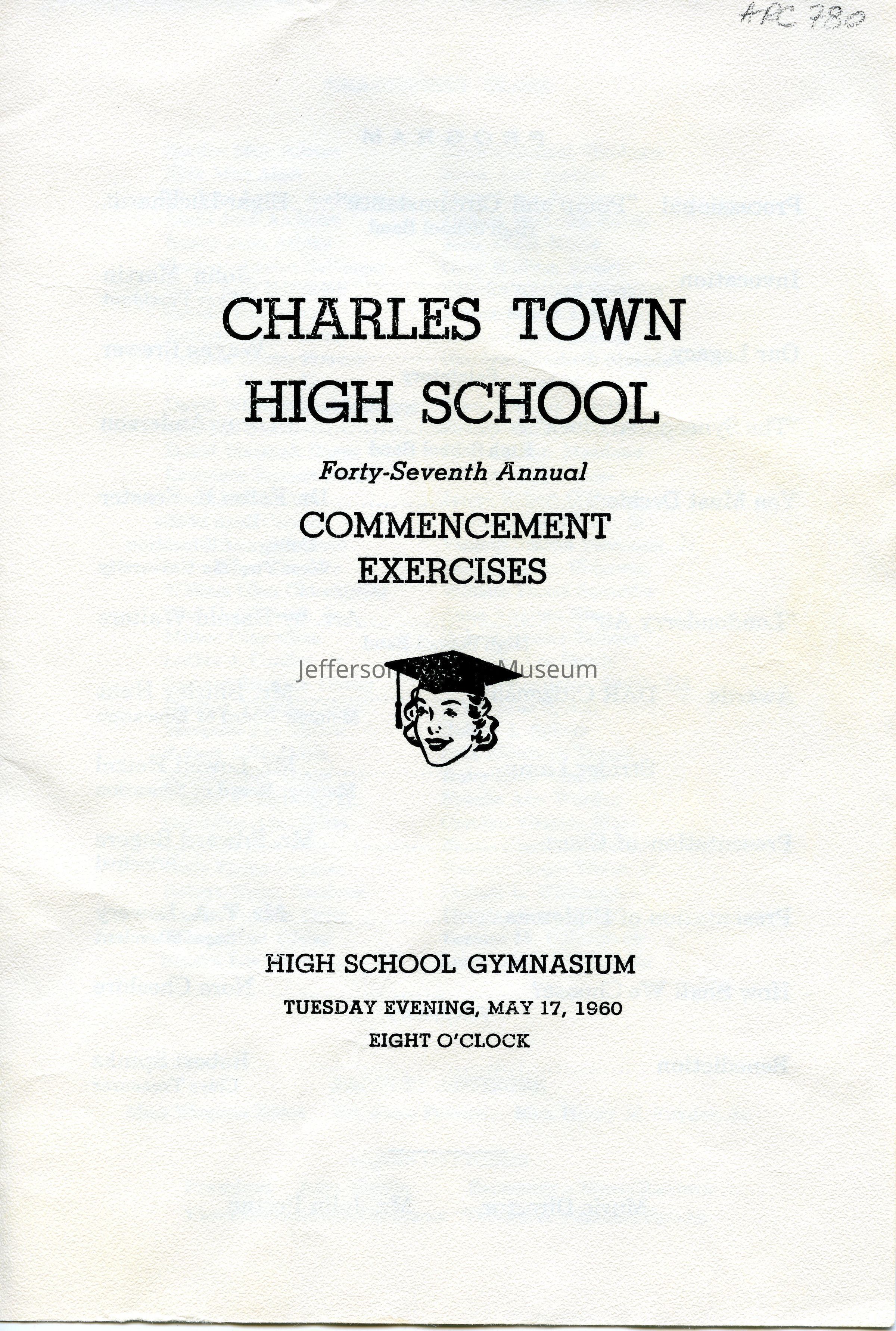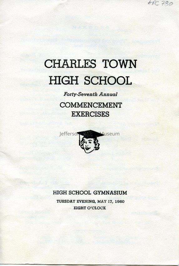 Charles Town High School graduation program, May 17, 1960. Bi-fold, printed in black. Graduating class listed on inside, faculty listed on back page.Acquisition