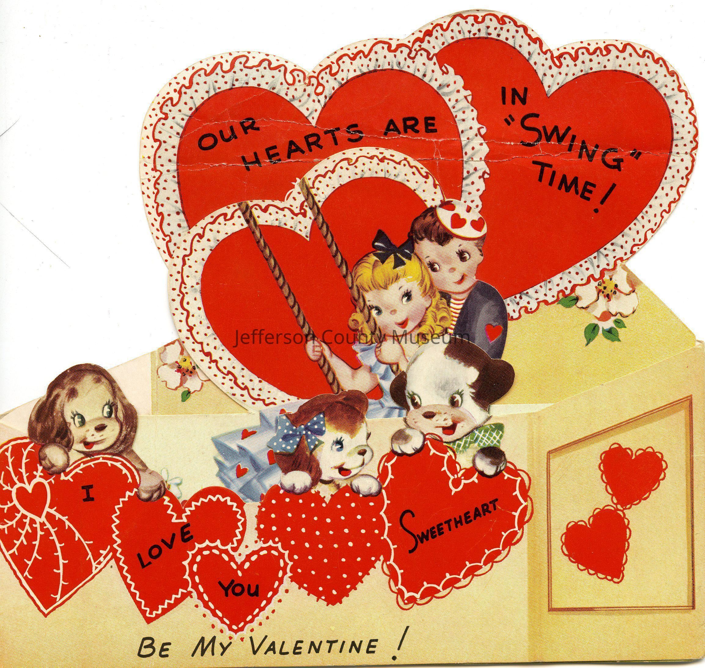 Fold-out valentine card. Printed in large hearts: "Our Hearts Are In 'Swing Time!'" and depicts a boy and girl on a swing. On back, hand-written in pencil: "Jean Kable / 4th / grade".Acquisition